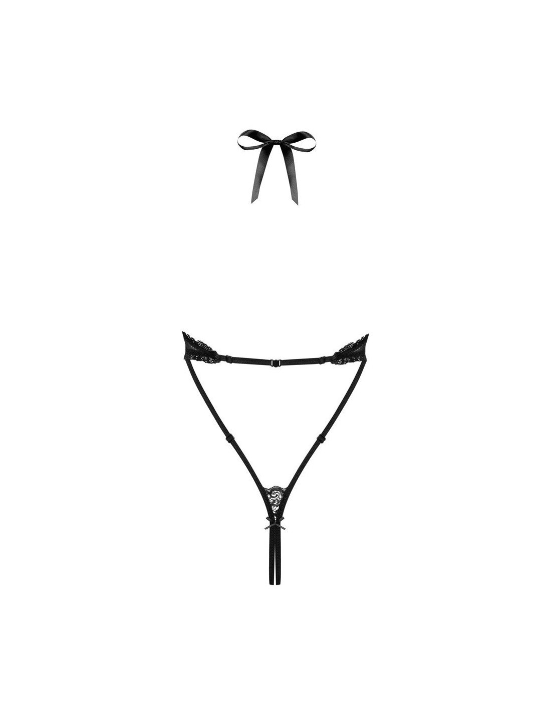 Sexy, intrigante e sensuale: il body in seducente pizzo con motivi floreali, collo all'americana, forma a V sul davanti per esaltare le curve del bacino e dei seni. Apertura regolabile sul davanti con nastrino satinato. La parte posteriore non lascia nulla all'immaginazione, scoprendo l'intero corpo. Una vestibilità perfetta sia sul davanti che sul retro grazie alle cinghie regolabili.