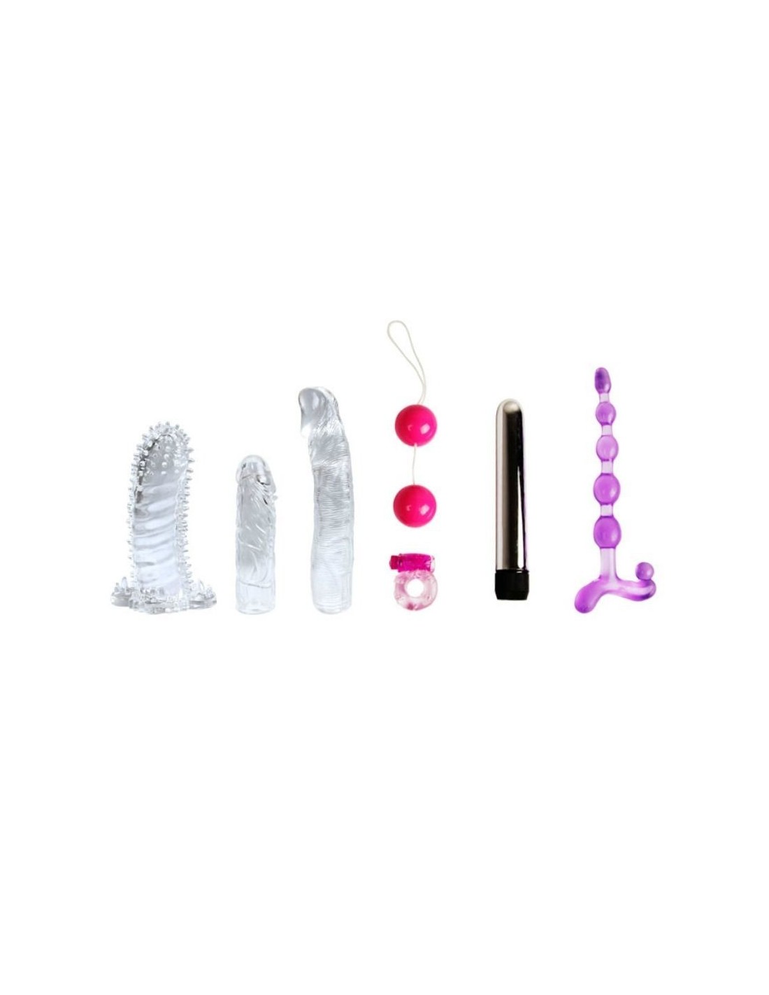 Il vibratore argentato, accompagnato dalle sue coperture, ti donerà una soddisfazione profonda, mentre il dildo traslucido è perfetto per momenti di divertimento intenso. L'anello fallico testurizzato si adatta al tuo pene e, sfregandolo delicatamente contro il clitoride del tuo partner, vi permetterà di godere insieme delle sue vibrazioni ritmiche. La catena anale graduata aggiunge una nuova dimensione di piacere, ideale per esplorare sensazioni sia anali che vaginali.