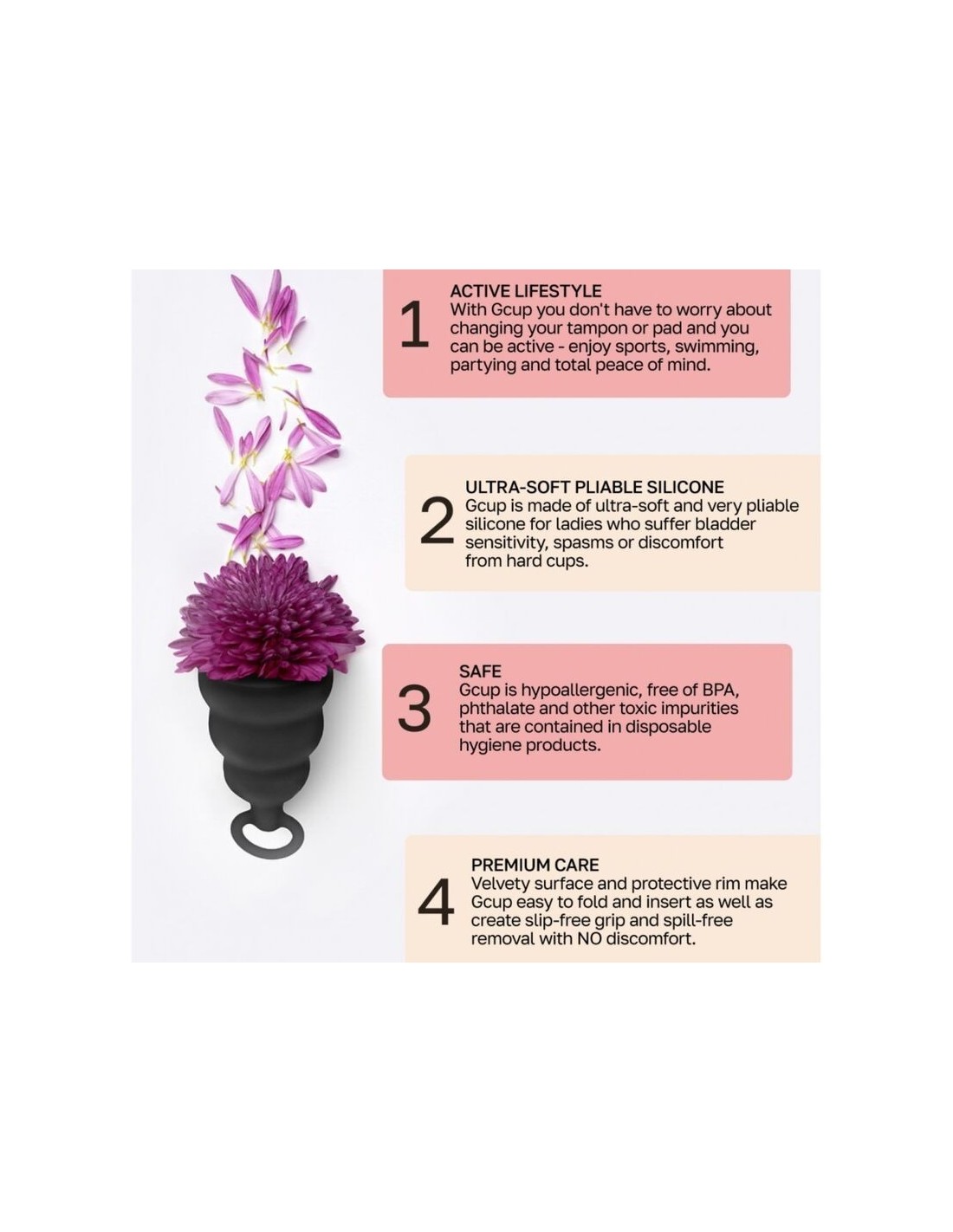 La coppetta mestruale Gcup ha una forma a campana che la rende facile e comoda da usare. Il suo vero punto di forza è la valvola di ritegno interna, che impedisce ai liquidi di ritornare nella vagina, anche durante le giornate più attive. Potrai continuare a svolgere le tue attività quotidiane, praticare sport e nuotare senza pensieri, dimenticandoti completamente di "quei giorni". La superficie della Gcup è morbida e liscia, con dimensioni studiate per risultare discreta e confortevole. Inoltre, scegliendo la Gcup risparmierai significativamente rispetto all’uso di assorbenti e tamponi tradizionali. È un prodotto sicuro per la salute femminile.