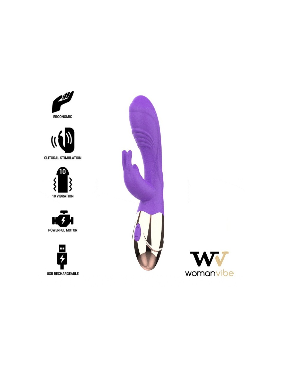 Womanvibe Viora è un vibratore Rabbit dal design sofisticato e accattivante, pensato per regalarti un piacere unico. La sua forma curva è perfetta per stimolare il punto G, mentre il piccolo stimolatore a forma di coniglio offre una delicata ma intensa stimolazione clitoridea, amplificando il piacere. Disponibile nei raffinati colori Oro e Lilla, questo vibratore ricaricabile è realizzato in silicone morbido e setoso, eco-friendly, privo di ftalati e delicato sulla pelle.