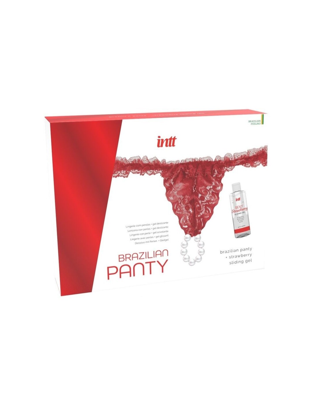 Brazilian Panty Red di INTT è un elegante e sensuale set di lingerie arricchito da perle e accompagnato da un gel lubrificante a base d'acqua dal delizioso gusto di fragola.