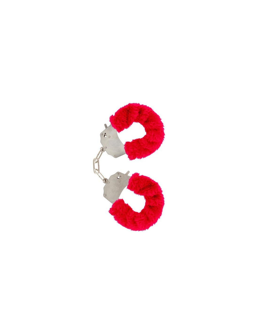 Eleganti manette da polso composte da due pezzi collegati da una catena in acciaio cromato, avvolte da un soffice rivestimento in peluche sui polsini rossi.