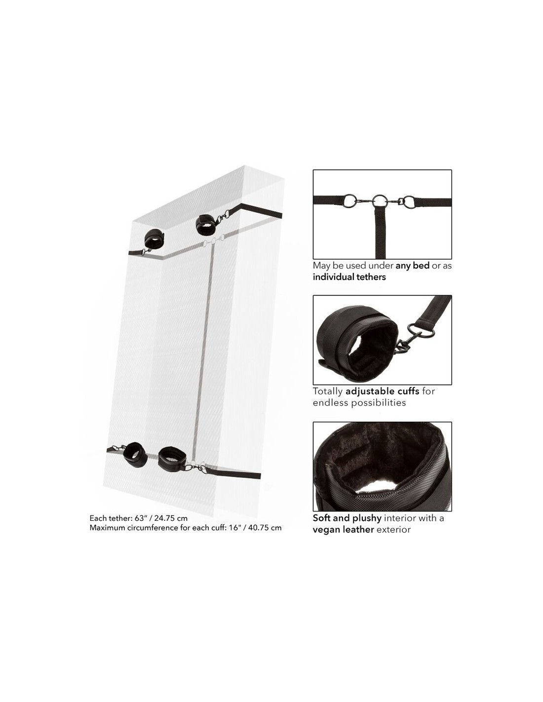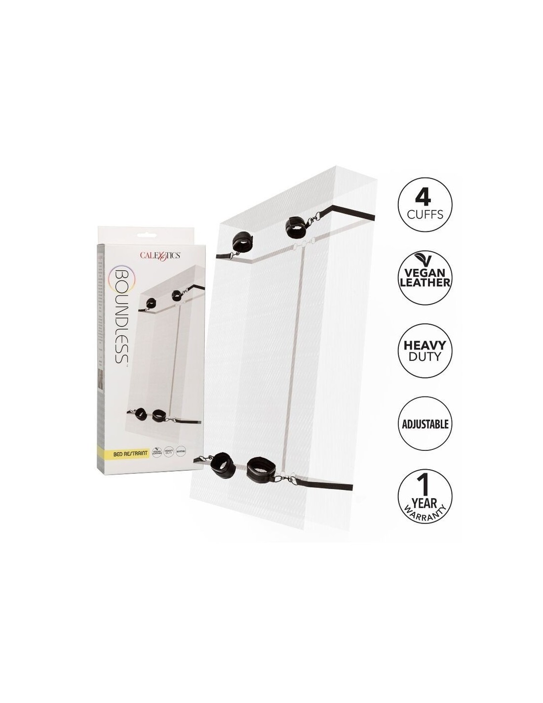Attenzione: il sistema di ritenuta per letto Boundless potrebbe trasformare le vostre serate in momenti indimenticabili e prolungati! Questo accessorio per adulti include polsini per polsi e caviglie, dotati di chiusure in velcro e anelli universali, pensati per garantire comfort e sicurezza durante l'uso.
