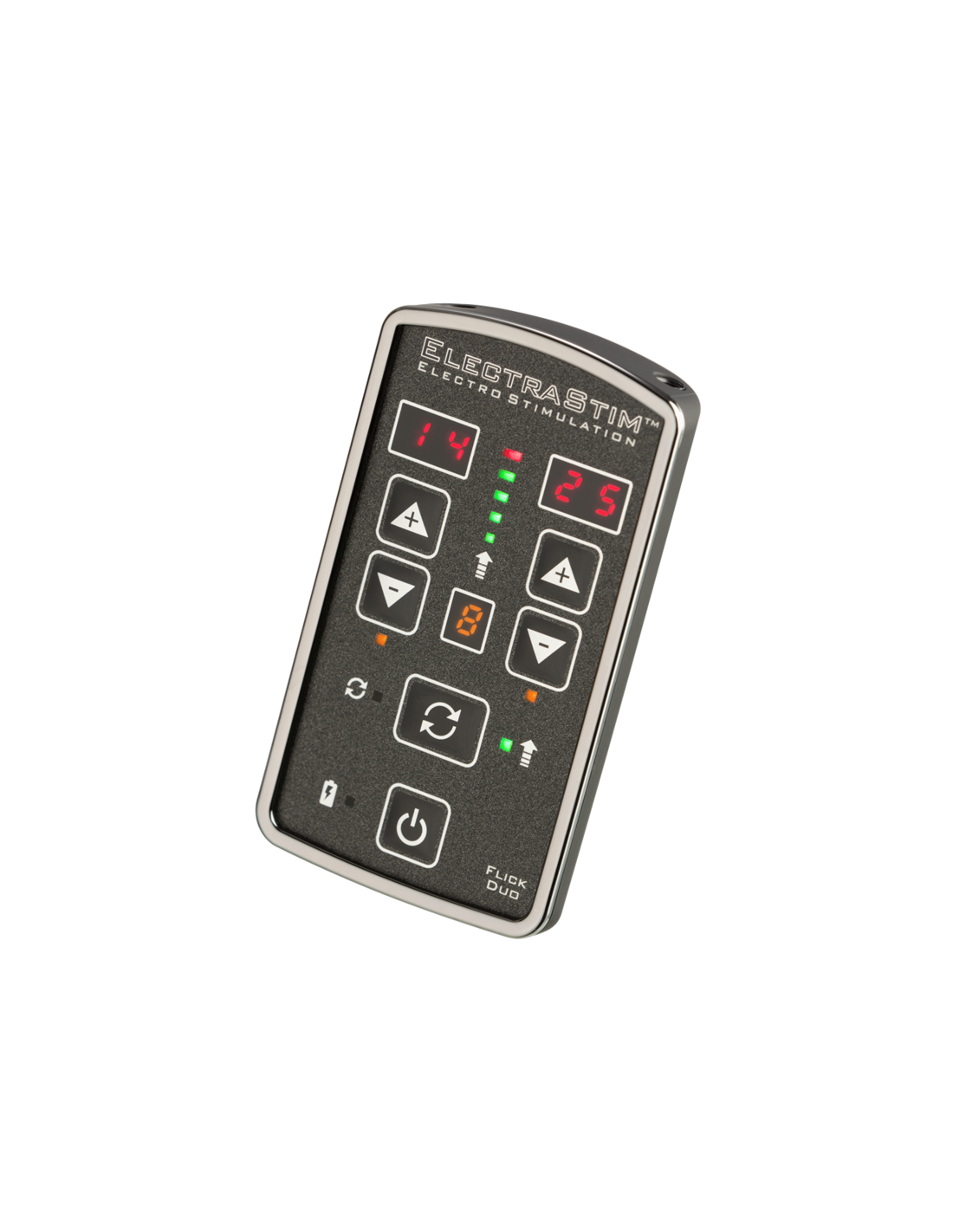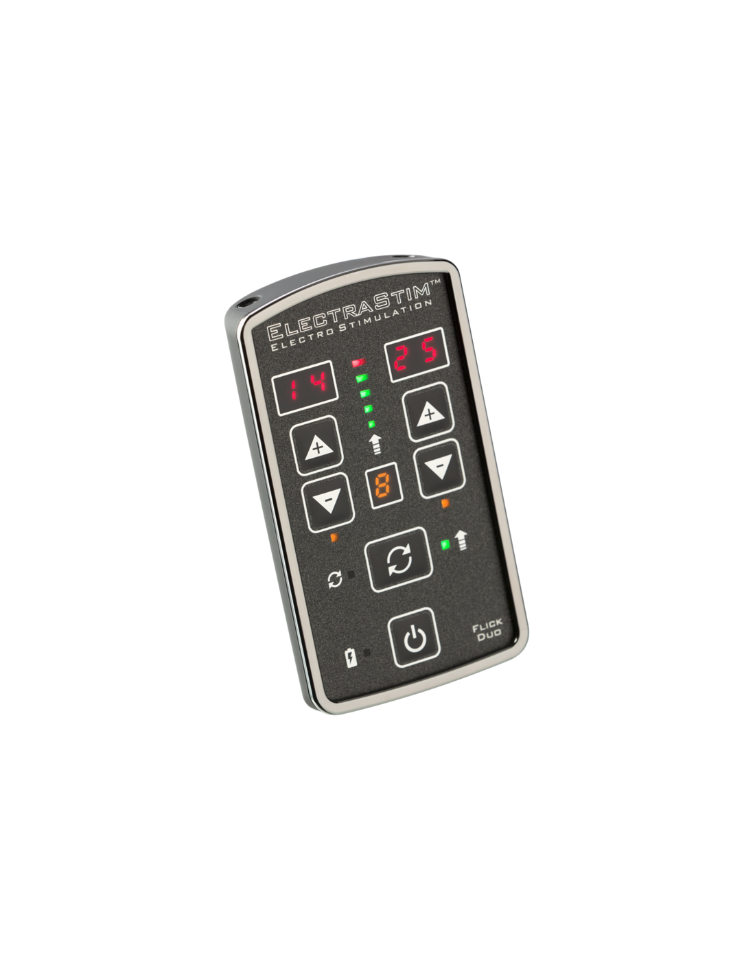 Perfetto per coppie e appassionati che vogliono utilizzare più giocattoli contemporaneamente, Flick Duo può gestire fino a 4 elettrodi unipolari o 2 bipolari allo stesso tempo. Ogni canale si controlla separatamente, offrendoti un controllo preciso sulle sensazioni e rendendo la stimolazione condivisa con il partner ancora più coinvolgente.