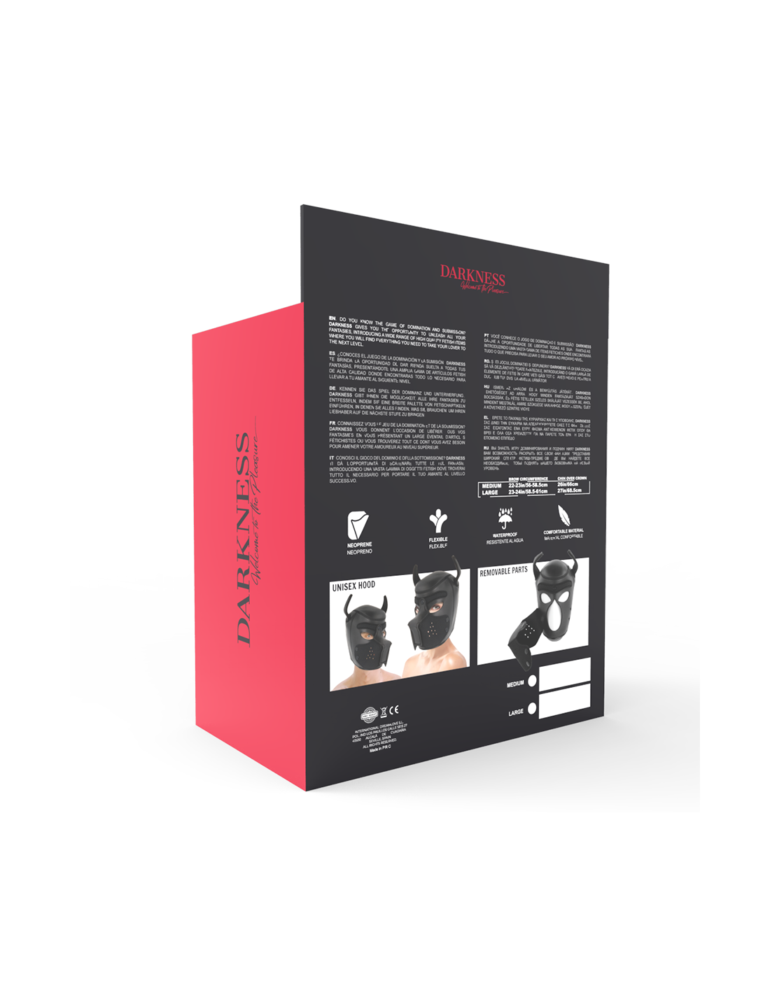 Questa maschera per cani, realizzata in neoprene, combina leggerezza, traspirabilità e comfort per un utilizzo piacevole. È dotata di una chiusura a scatto sul retro che assicura il fissaggio delle orecchie e del muso nella posizione desiderata.