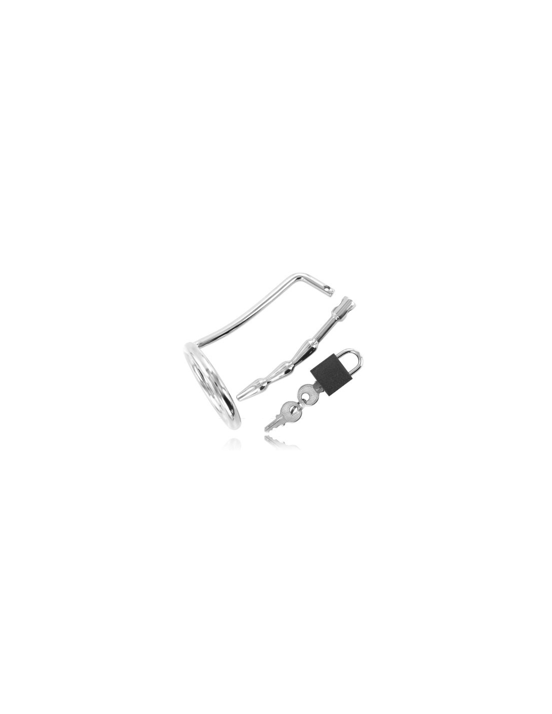 Esplora il tuo lato più bdsm! Posiziona l'anello metallico alla base dei testicoli e inserisci il tappo di metallo nell’uretra del pene, chiudi il tutto con il lucchetto e... il gioco ha inizio! È vietato avere erezioni.