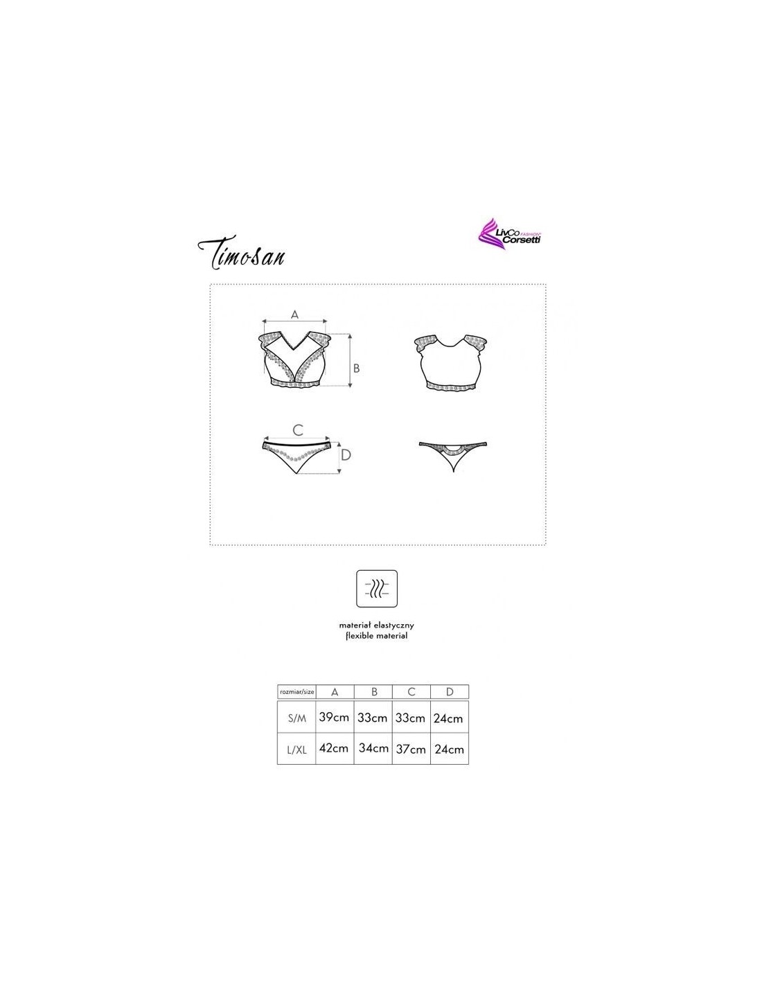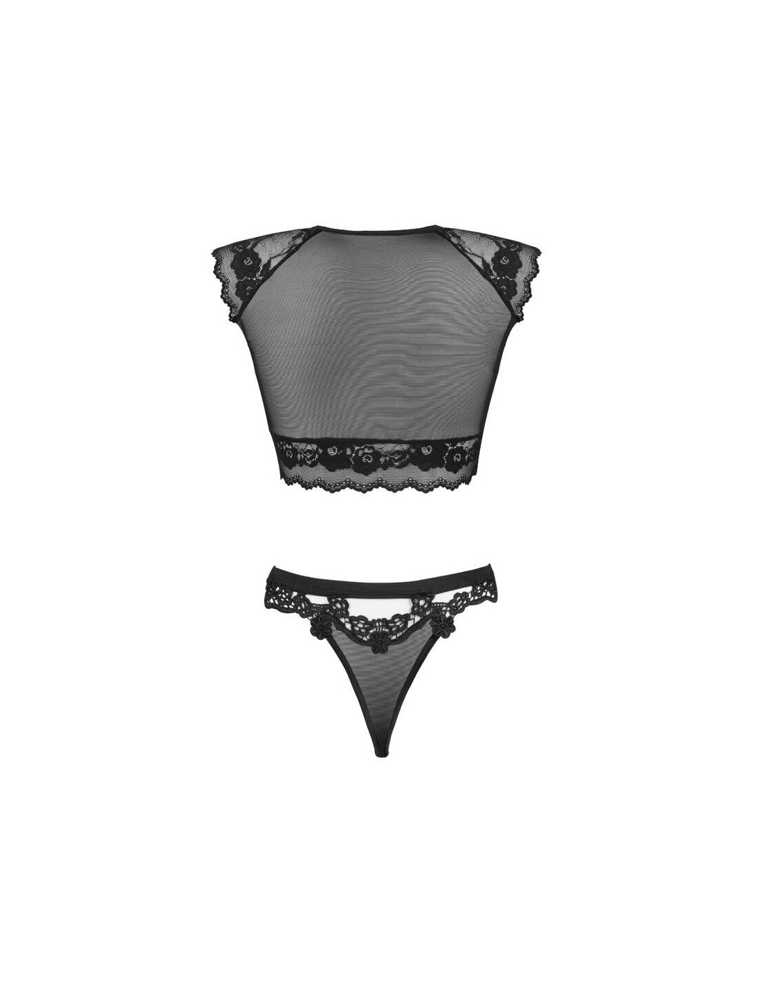Il raffinato e femminile set Timosan in due pezzi è la scelta ideale per donne sicure di sé. Il reggiseno integrato, realizzato in un tessuto trasparente e morbido al tatto, valorizza le curve mantenendo un tocco di mistero. Lo scollo a V e la schiena con design ricostruito, completamente trasparente, donano un effetto elegante e seducente. Il completo include anche un perizoma confortevole e dal design accattivante, con una parte anteriore che abbina trasparenze a inserti in pizzo, per un look moderno e affascinante. Il taglio deciso sulla schiena esalta una silhouette armoniosa e femminile. Timosan è perfetto per chi cerca lingerie sexy e comoda, adatta sia a occasioni speciali che all’uso quotidiano. Realizzato con tessuti elastici e aderenti, questo completo nero si presta perfettamente sotto pantaloni o abiti da sera e cocktail aderenti.