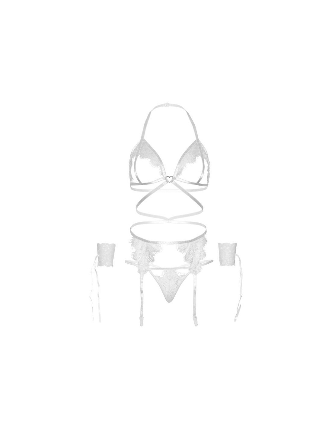 Set da 4 pezzi composto da reggiseno a coppa aperta con cinturino a gabbia in pizzo rifinito con anello a forma di cuore, reggicalze, slip perizoma e polsini, firmato dal prestigioso marchio di lingerie Leg Avenue. Scopri un tocco di femminilità unico grazie a questo capo esclusivo che unisce seduzione, sensualità ed eleganza.