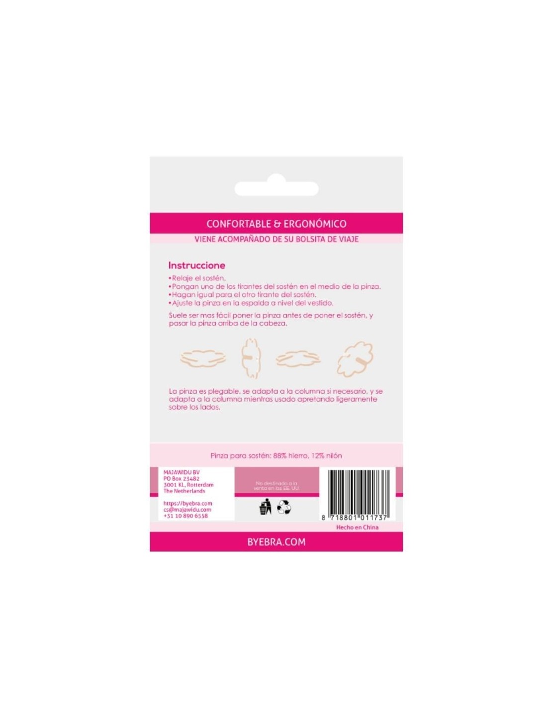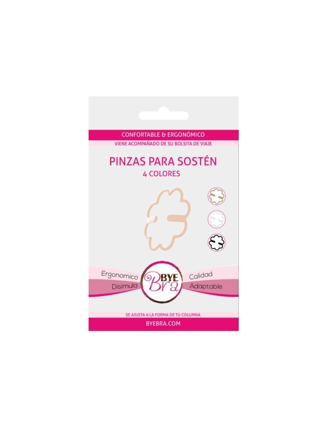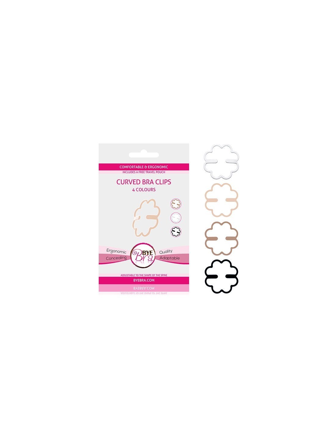 Bye Bra presenta una nuova generazione di clip per reggiseno che rivoluzionano gli accessori tradizionali. La pinza Bye Bra è ergonomica e pieghevole: può essere allungata e modellata per adattarsi perfettamente alla forma della schiena. Nascondere le spalline del reggiseno diventa così semplice e confortevole, perché la clip si adatta perfettamente al corpo e risulta quasi impercettibile. Ogni confezione contiene quattro pinzette, ognuna di un colore diverso.