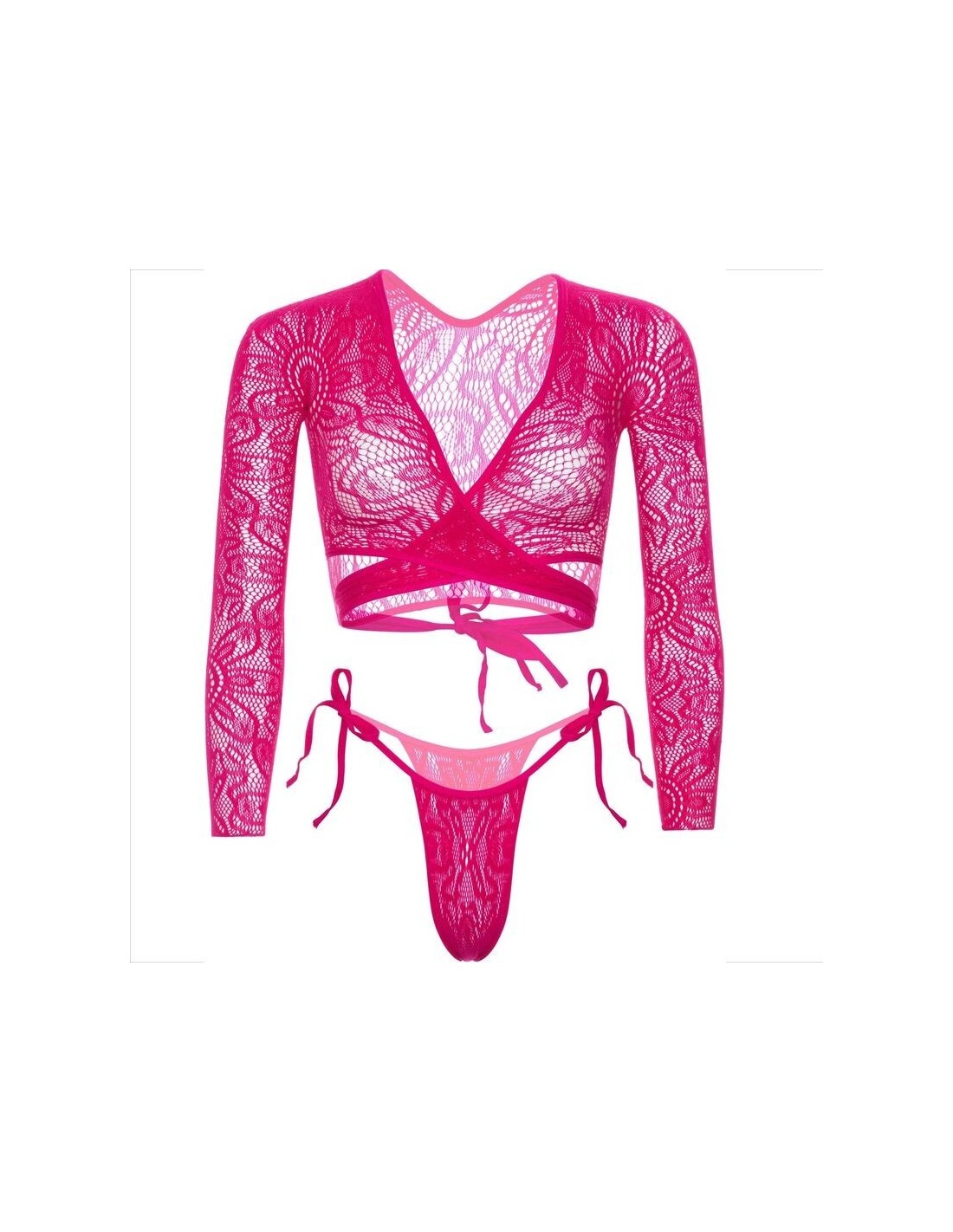 Scopri un mondo di eleganza e seduzione con il nostro raffinato set di lingerie, composto da un top corto in pizzo che avvolge delicatamente il corpo e da sensuali pantaloni con lacci laterali. Questo esclusivo completo unisce la leggerezza del pizzo a dettagli audaci, creando un’esperienza unica che esalta la tua femminilità con un tocco di charme giocoso.
