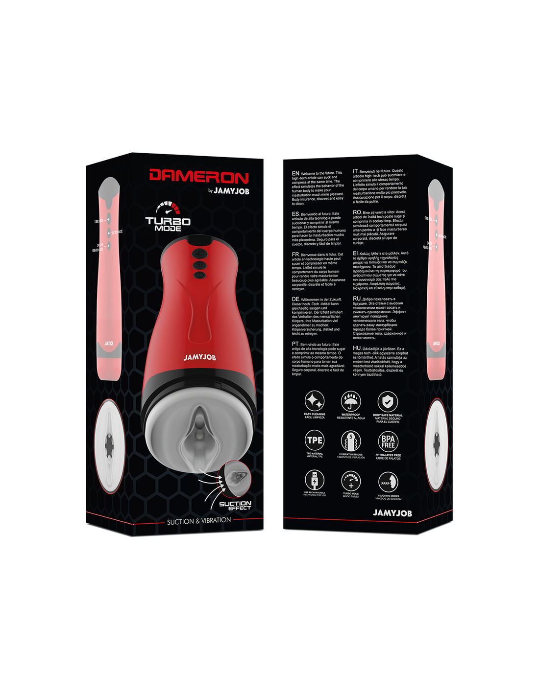 Jamyjob è un giocattolo impermeabile realizzato in silicone medico morbido e setoso, estremamente scivoloso e capace di assorbire rapidamente il calore corporeo. La pulizia è semplice: basta un po’ di sapone sotto acqua tiepida. Per un’igiene ancora più accurata, ti consigliamo di utilizzare un detergente disinfettante specifico per giocattoli, come lo spray coordinato di Waterfeel. Per un piacere ottimale, usa sempre il tuo Dameron con i lubrificanti a base d’acqua Waterfeel, disponibili nelle varianti classica, setosa e calda. Questi lubrificanti vegani proteggono il materiale e mantengono la superficie del giocattolo liscia e piacevole al tatto.