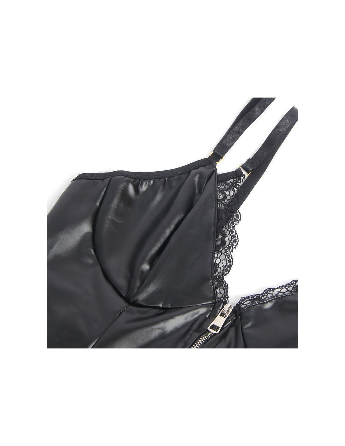 Vivi la sensualità nella sua forma più raffinata con il set di lingerie in pizzo nero SUBBLIME, arricchito da dettagli in pelle PU, reggicalze e cerniera frontale. Pensato per chi desidera un look audace, elegante e sicuro di sé, questo capo unisce la delicatezza del pizzo alla lucentezza della pelle PU, creando un equilibrio perfetto tra raffinatezza e seduzione, ideale per serate indimenticabili.
