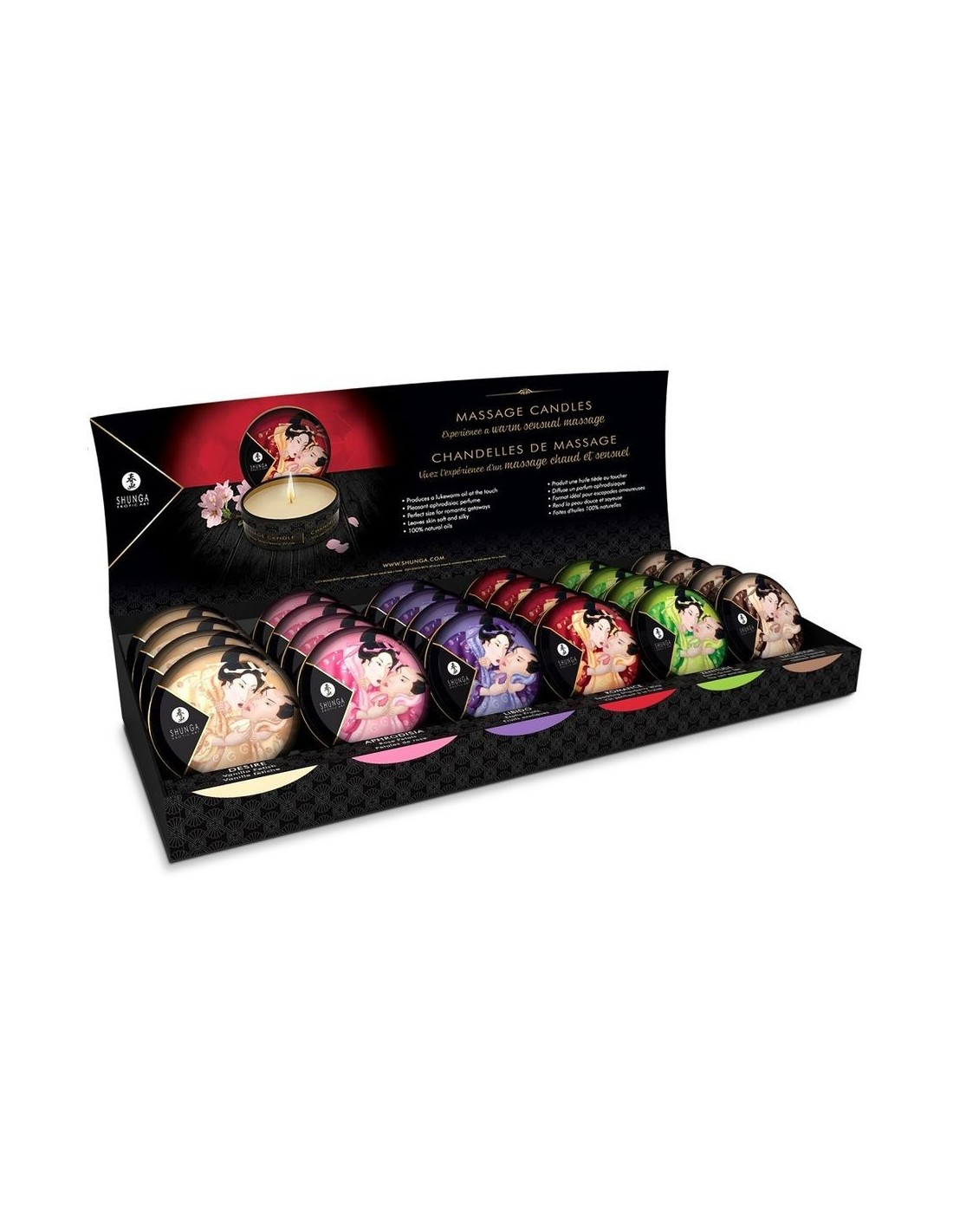 Questo espositore/set contiene 6 modelli di candele Shunga da 30 ml ciascuna, con i seguenti aromi: