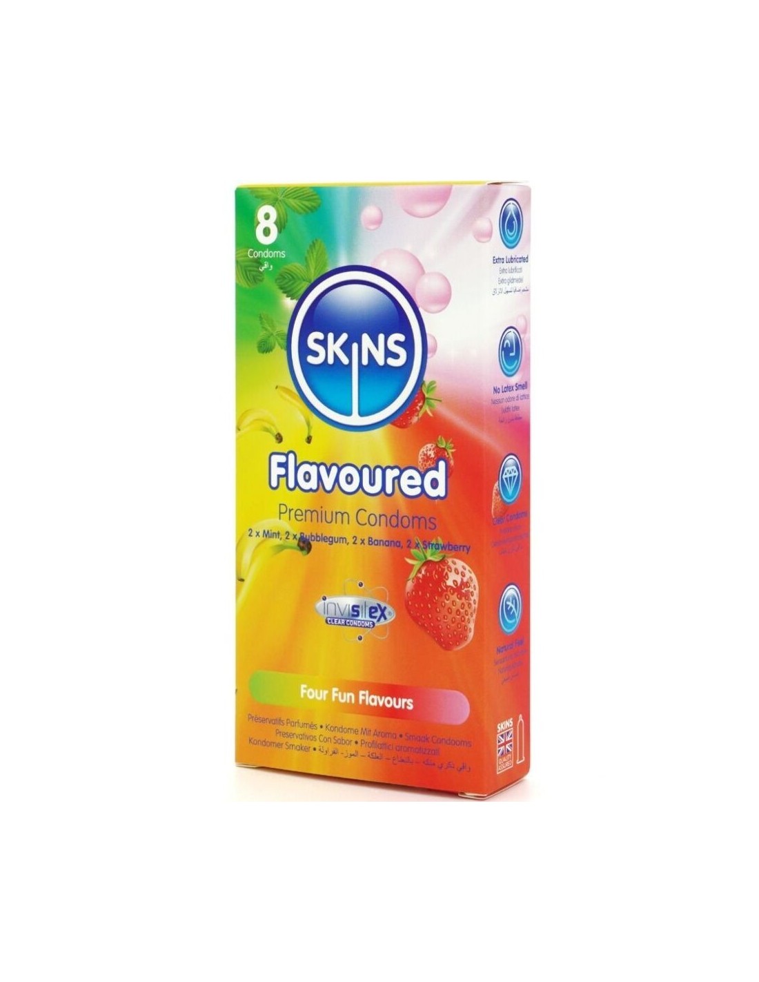 Vi presentiamo la confezione da 8 preservativi Skins Flavor: un39elegante soluzione pronta all39uso che offre fino al 33% di preservativi in più per confezione rispetto al leader di mercato. Questa entusiasmante confezione multipla include quattro invitanti gusti: Banana, Gomma da masticare, Menta e Fragola, offrendo ai consumatori un modo divertente e gustoso per migliorare l39intimità in ogni occasione. Ogni preservativo è confezionato singolarmente e realizzato in lattice naturale di alta qualità, che offre una sensazione naturale, trasparenza e resistenza. Arricchiti con una lubrificazione extra e deliziose fragranze, questi preservativi eliminano il tipico odore di lattice per garantire un39esperienza più piacevole.