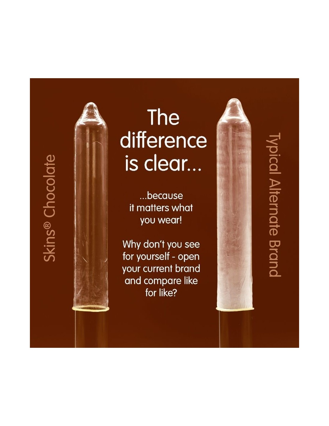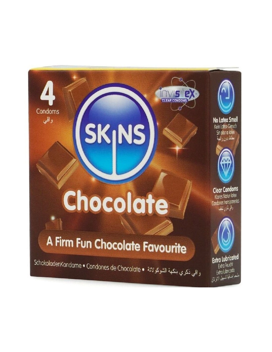 Vi presentiamo la nostra nuova confezione da 4 al gusto di cioccolato, caratterizzata da un design elegante e pronto all39uso e fino al 33% di preservativi in più rispetto al leader di mercato. I preservativi Skins al gusto di cioccolato sono perfetti per chi cerca un prodotto intimo divertente e di alta qualità. Questi preservativi confezionati singolarmente combinano un gusto piacevole con una protezione superiore, rendendoli la scelta ideale per negozi di articoli per adulti, farmacie e negozi di prodotti per il benessere. Questi preservativi Skins sono un ottimo modo per unire due amori: il sesso e il cioccolato. Sono lubrificati e hanno un delizioso aroma di cioccolato davvero invitante, e hanno anche il sapore del cioccolato. Come tutti i preservativi Skins, sono realizzati in lattice di alta qualità, dermatologicamente testato, per offrirti la protezione di cui hai bisogno.