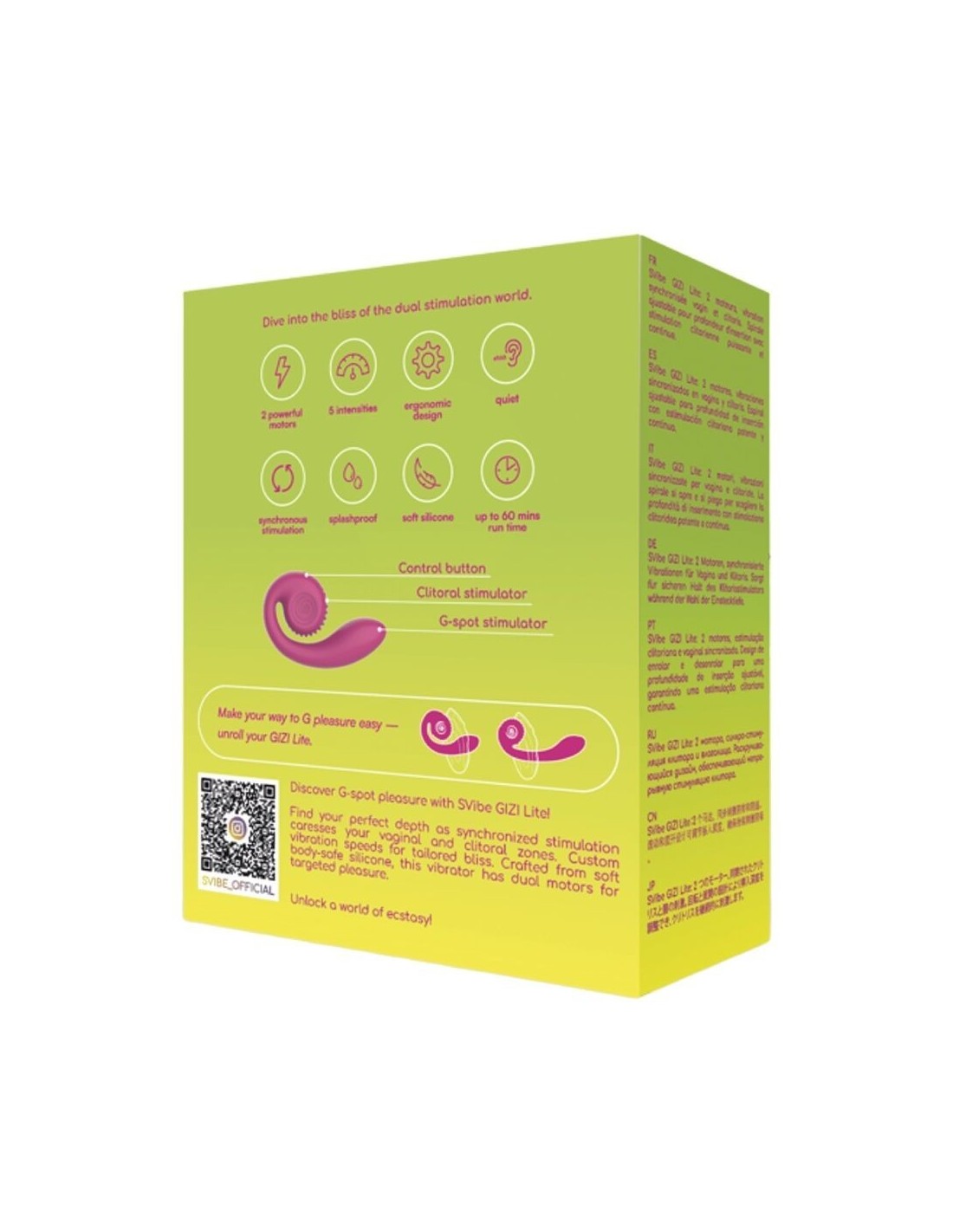 SVibe GIZI Lite è progettato per esplorare e potenziare il piacere del punto G attraverso una doppia stimolazione perfettamente sincronizzata. La sua forma permette di trovare la profondità ideale, mentre le vibrazioni accarezzano contemporaneamente sia la zona vaginale che quella clitoridea, creando un39esperienza equilibrata, immersiva e profondamente appagante.