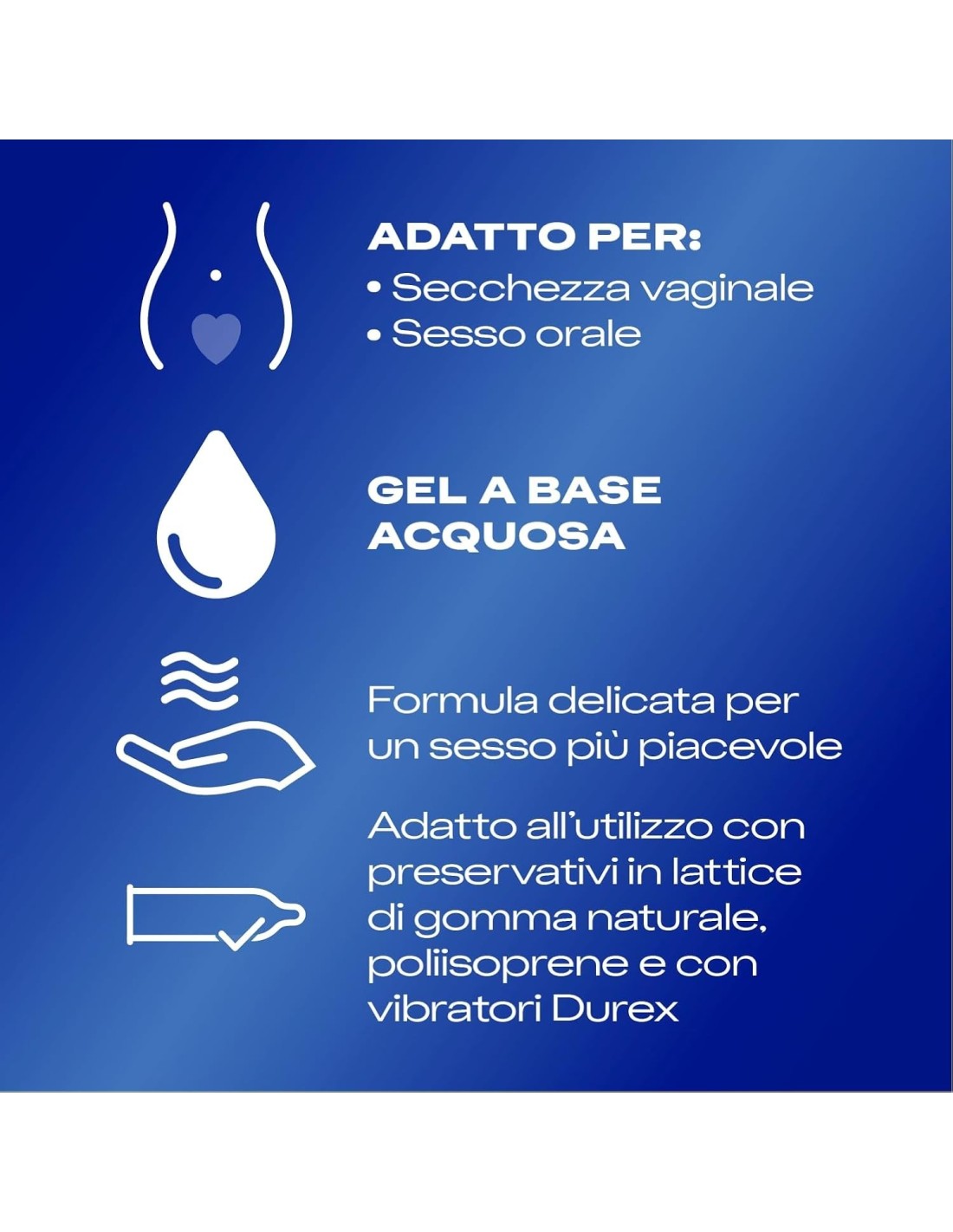 Top Gel feel è un lubrificante intimo Durex ad effetto seta, che rende più agile il rapporto e aumenta il piacere, offrendo ad entrambi i partner un'esperienza sessuale più intensa. Con Top Gel si riduce l'attrito dovuto a una parziale mancanza di lubrificazione naturale lasciando nel contempo una piacevole sensazione di freschezza.