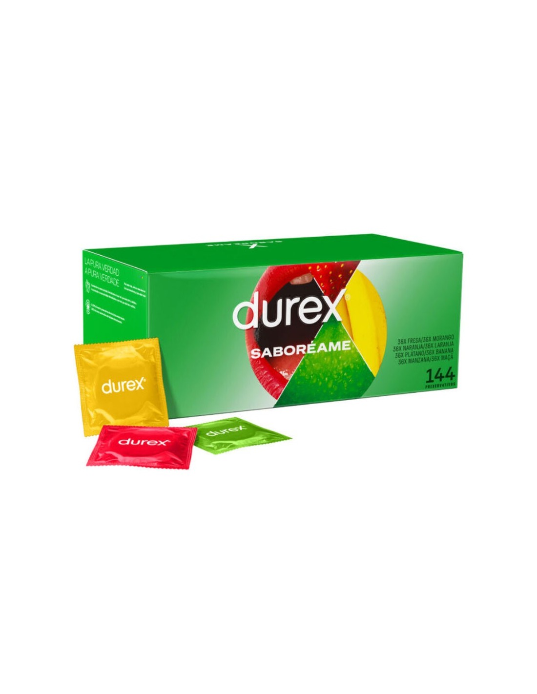 Alla banana, alla fragola, alla arancia e alla mela sono i sapori e i profumi dei preservativi aromatizzati Durex Pleasurefruits venduti nel pacco scorta da 144 pezzi.