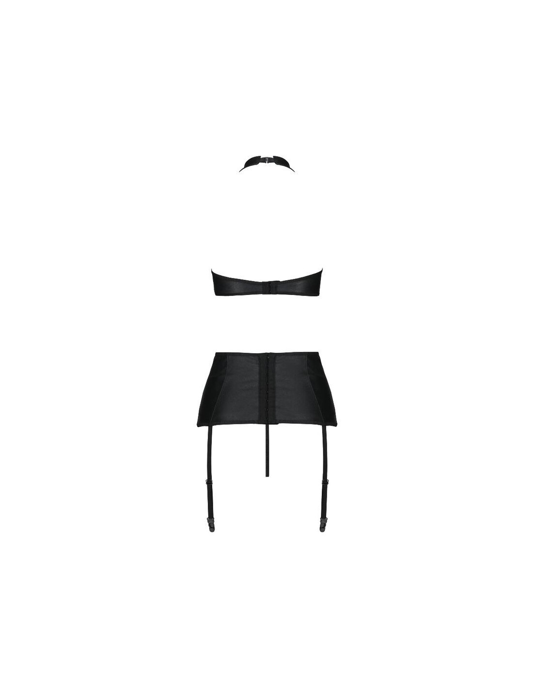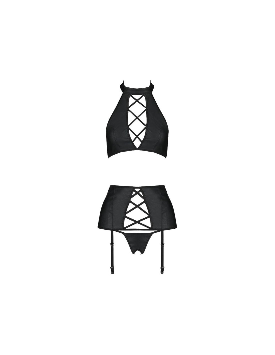 Il set Nancy di Passion è un elegante insieme in tre pezzi, composto da un top con allacciatura alla caviglia, un reggicalze e un perizoma dal design audace. Realizzato in pelle nera, questo set è arricchito da numerose strisce incrociate che esaltano la femminilità in modo sofisticato.