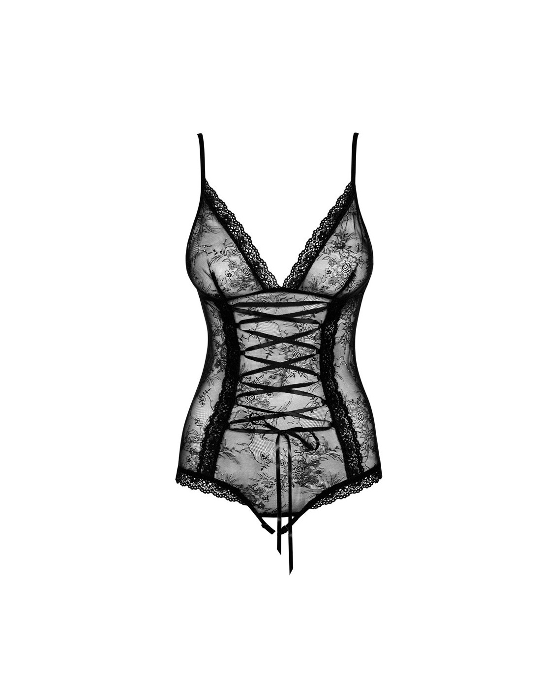 Sexy, romantico ed estremante sensuale, il body Obsessive Slevika è realizzato in tessuto semi trasparente, pizzo con motivo floreale e nastrini regolabili di raso nero.