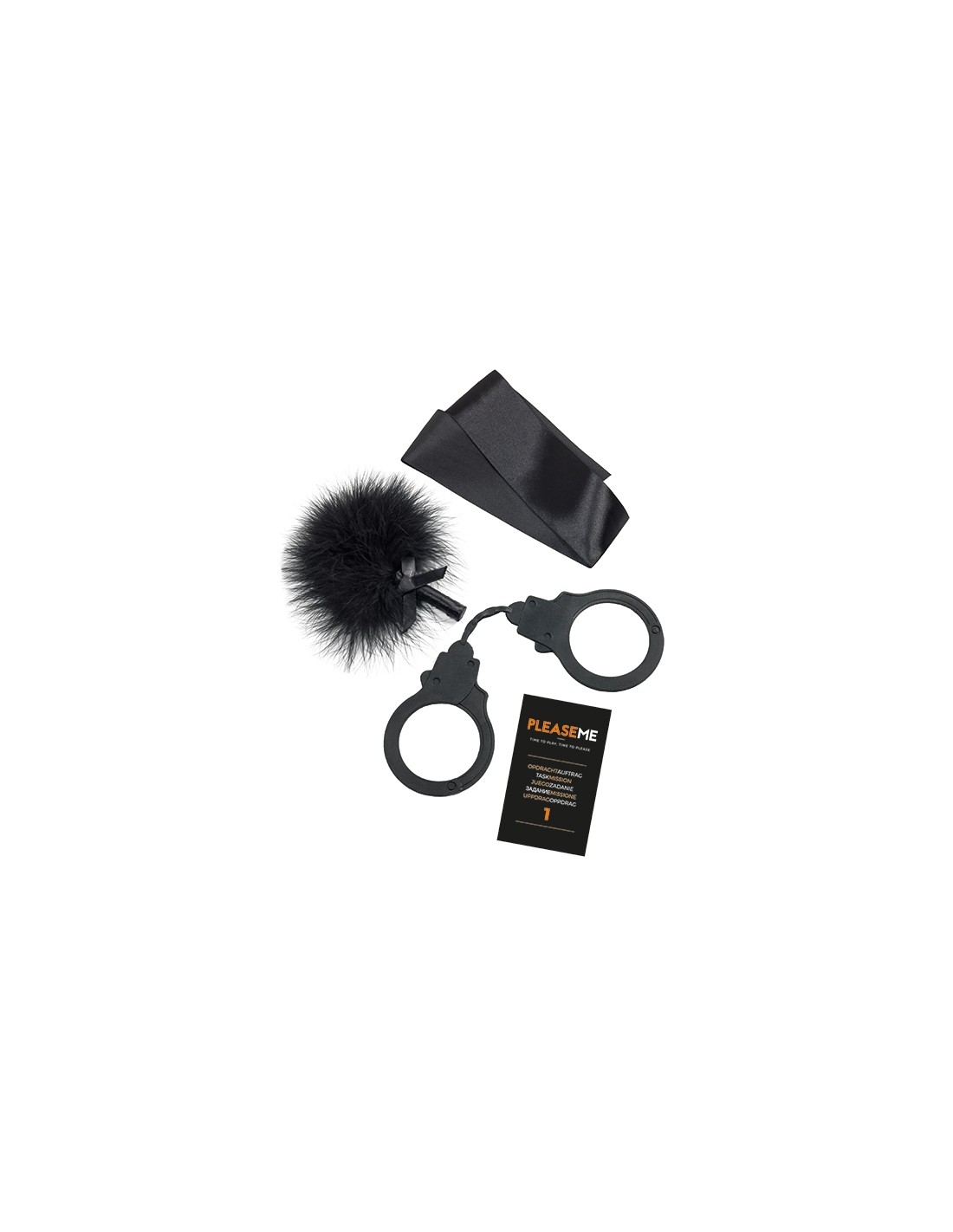 Un kit Bondage composto da Manette, Benda, Piumino titillante e 6 intriganti missioni da provare col partner tradotte in 10 lingue.