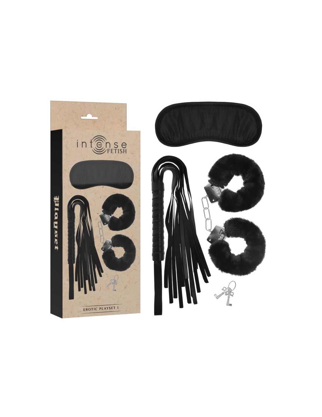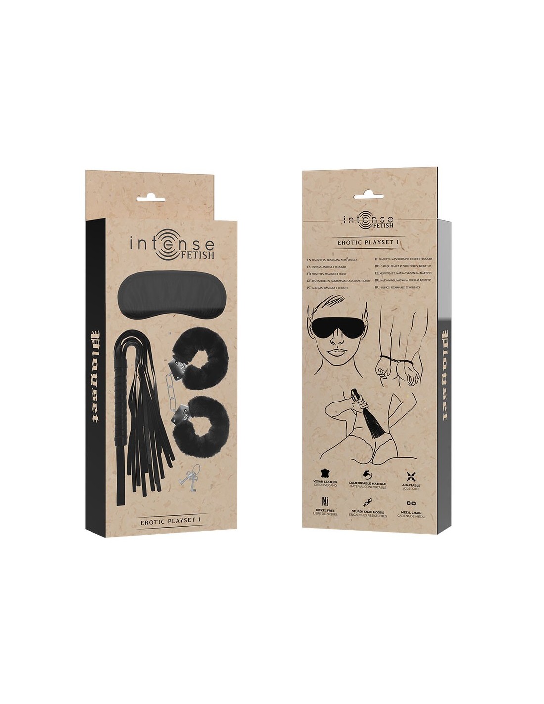 INTENSE FETISH Erotic Playset 1 è kit accattivante con elementi essenziali per rendere eccitanti e sensuali i vostri momenti più intimi: mascherina, manette e frustino realizzati in pelle vegana di alta qualità. Un kit perfetto per una serata erotica all'insegna del piacere esplosivo!
