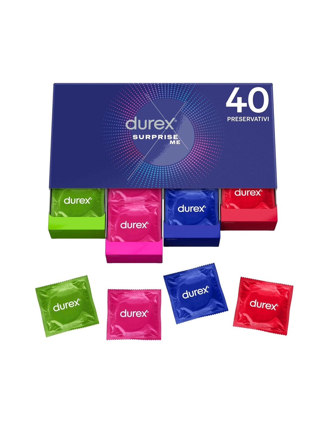 Durex Surprise Me Deluxe è un cofanetto contenente 40 profilattici assortiti, che grazie alle loro singolarità sapranno regalarti sensazioni indimenticabili