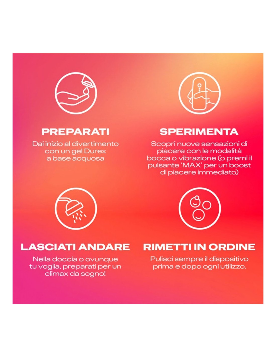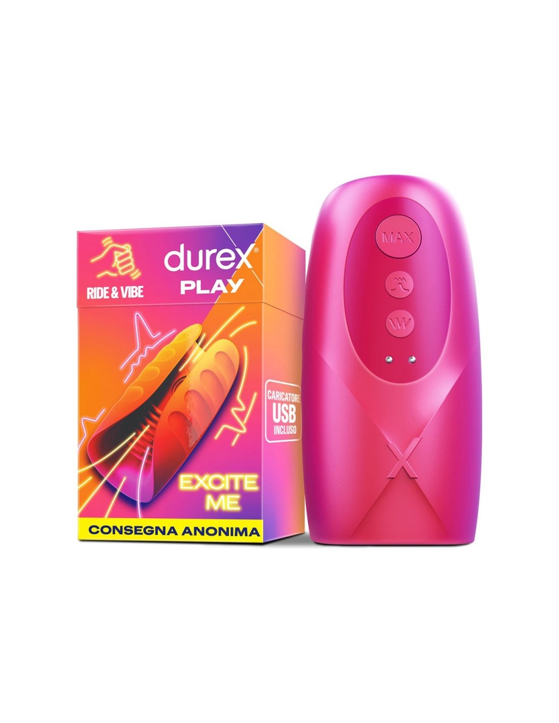 Durex Ride & Vibe è il nuovo masturbatore vibrante firmato Durex, dotato di 7 livelli di vibrazione, tra cui 3 esclusive modalità effetto bocca. Preparati a scoprire sensazioni completamente nuove: grazie al tasto MAX potrai passare da una stimolazione delicata a un’intensità più decisa e coinvolgente. Scegli tu come raggiungere il massimo del piacere!