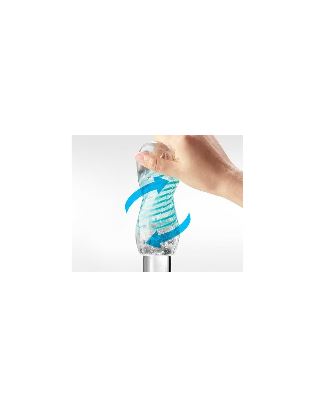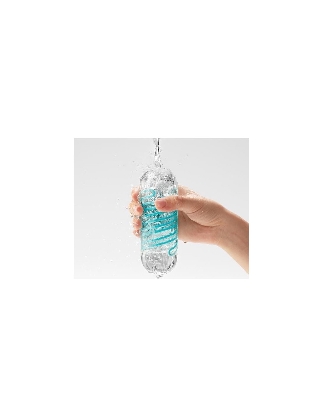 Riposto in un contenitore di plastica rigido, il masturbatore Tenga è realizzato in elastomero, materiale estremamente morbido ed elastico e sicuro per la salute. Trasparente con delle strisce a spirale colorate di blu.