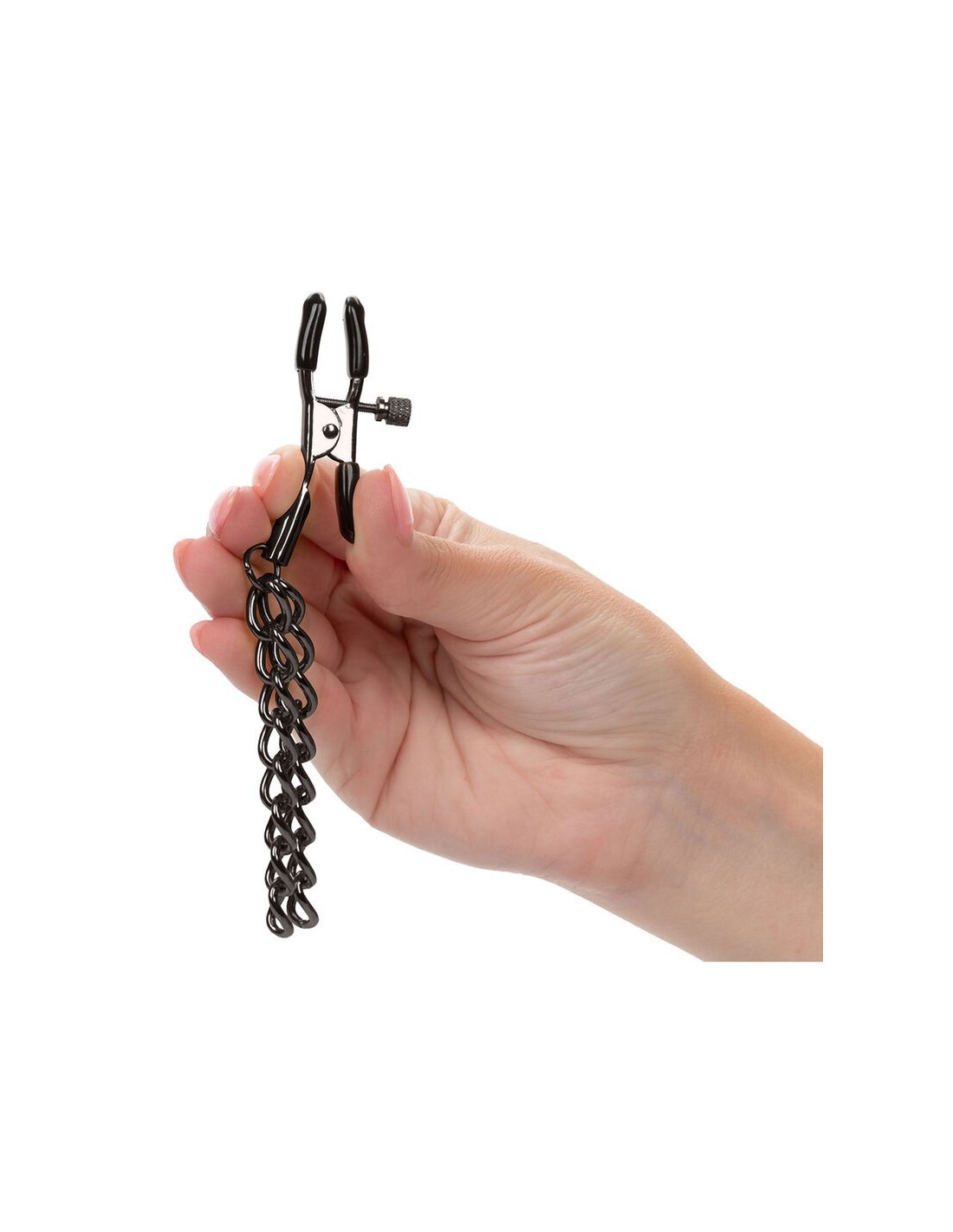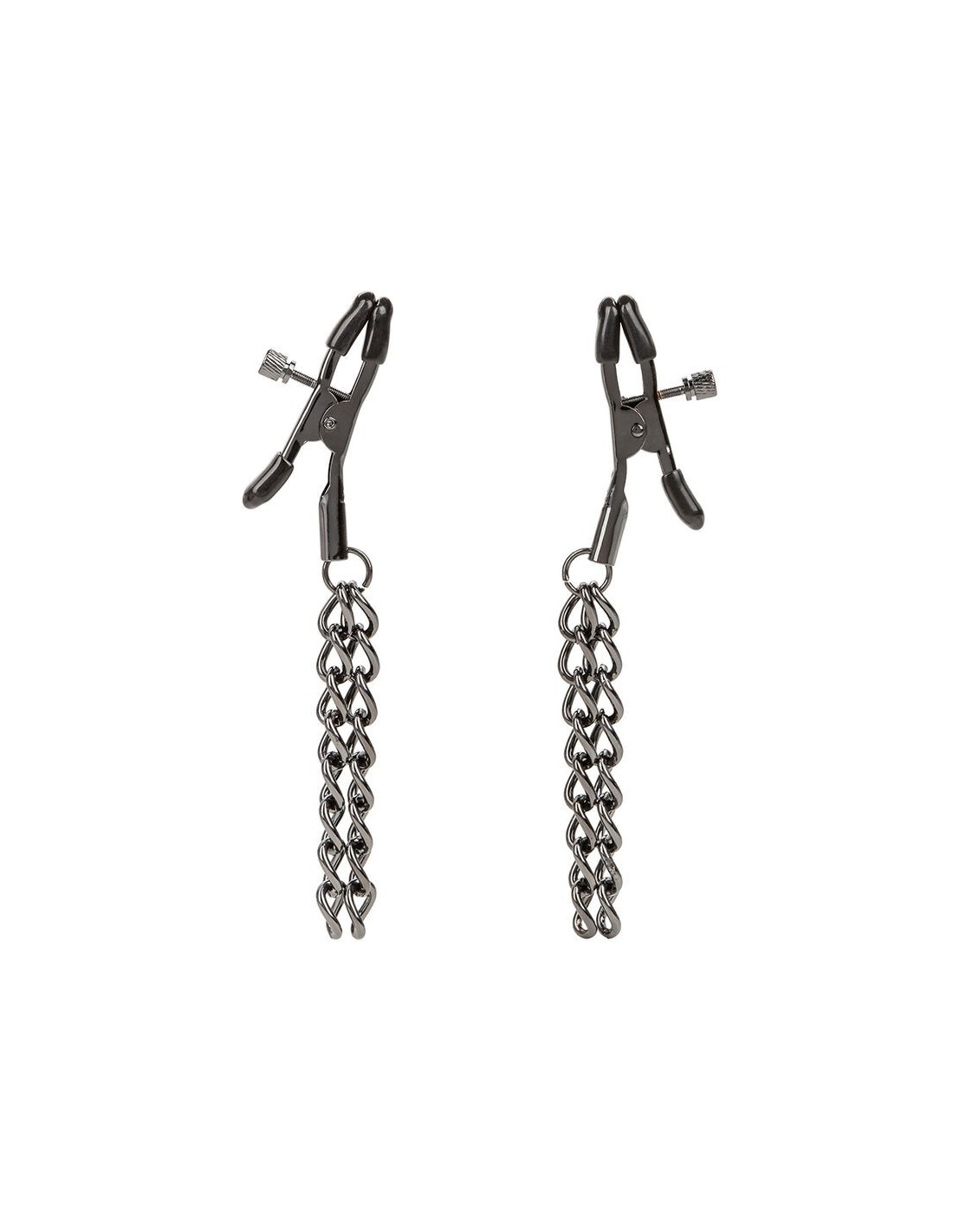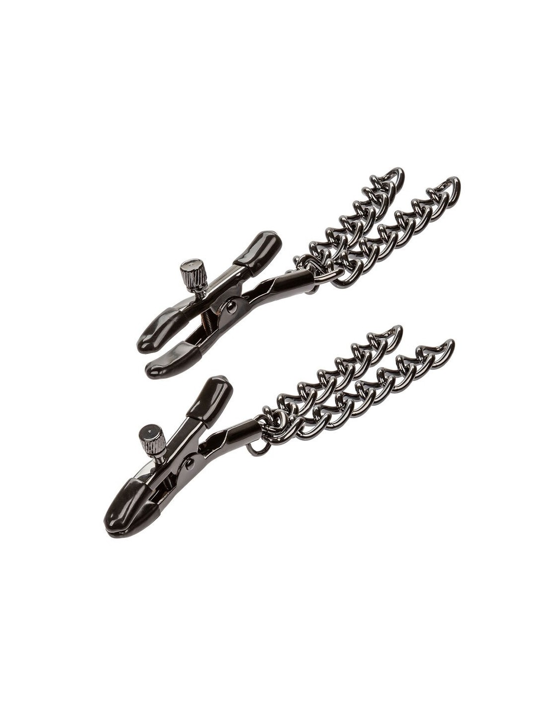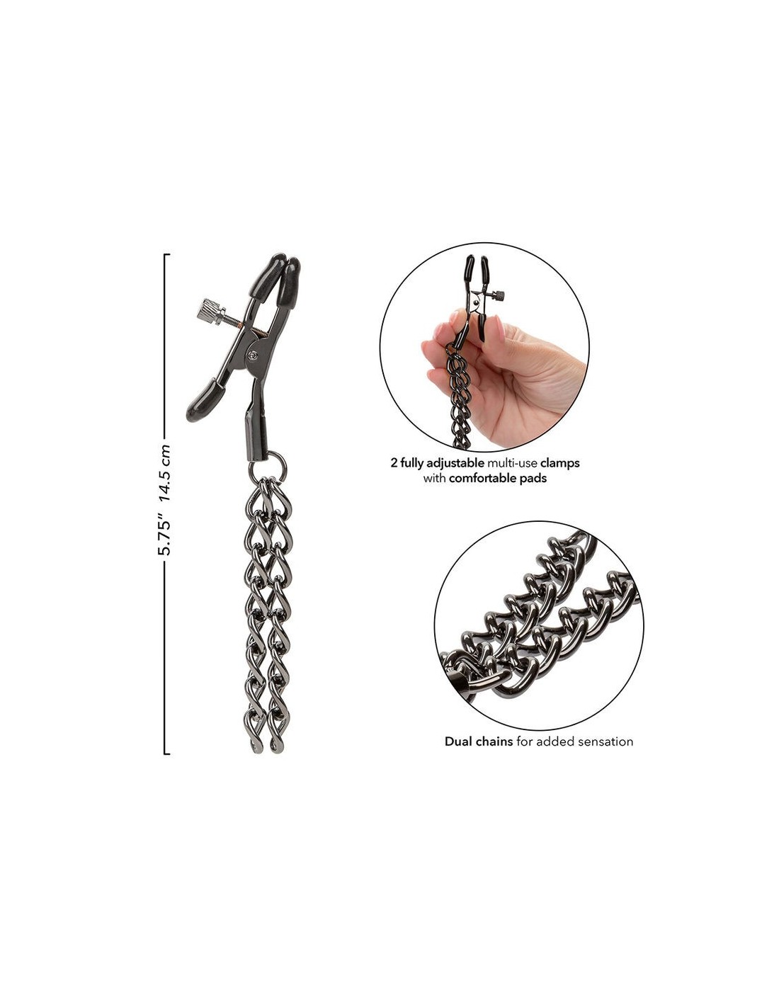 I morbidi cuscinetti garantiscono un contatto delicato, ampliando le possibilità del gioco sensoriale. Le doppie catene, che scendono con eleganza da ogni morsetto, intensificano le sensazioni ad ogni movimento. Realizzate con dettagli metallici senza nichel, assicurano una seduzione sicura e senza pensieri.