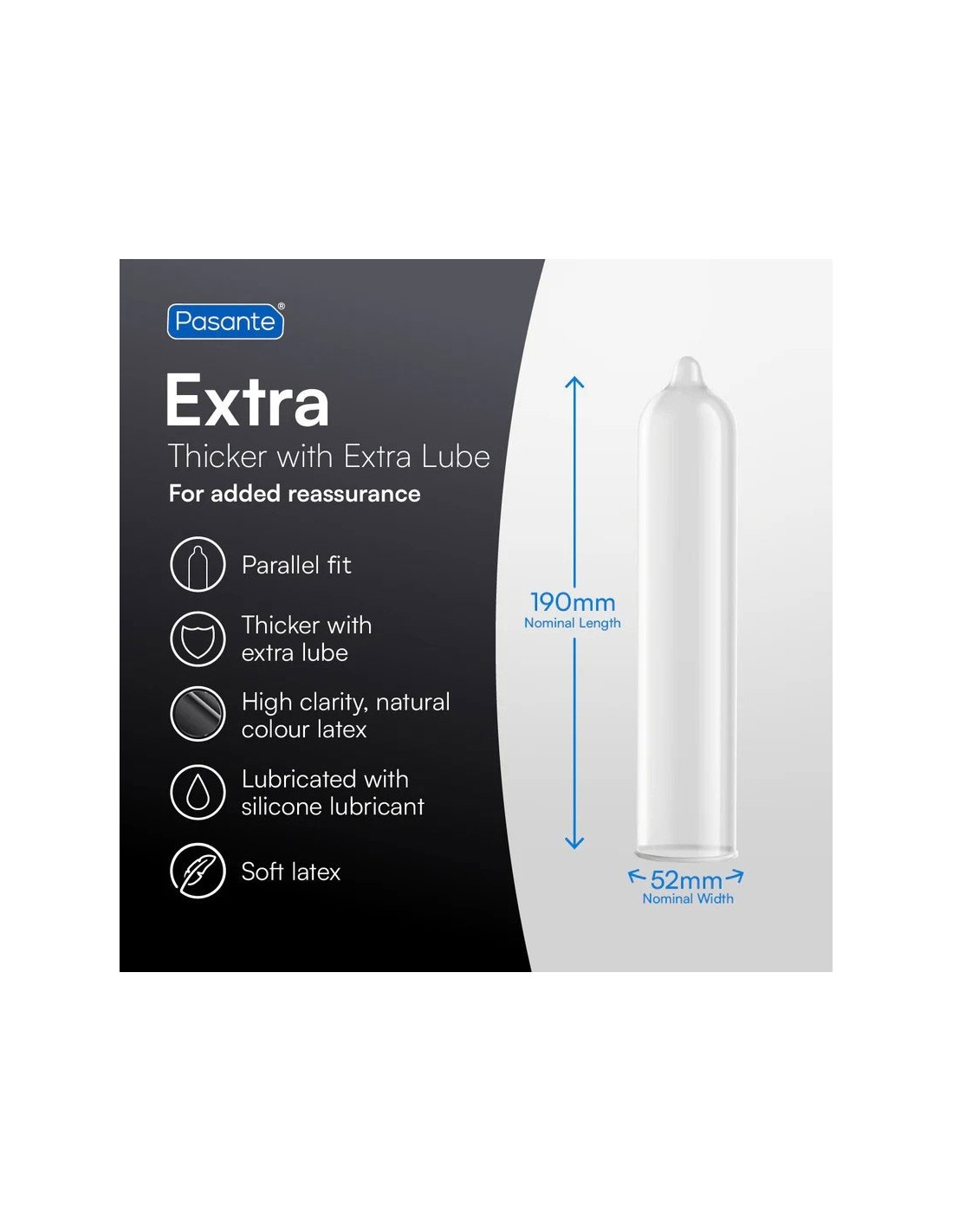 La lubrificazione abbondante a base di silicone contribuisce a ridurre l’attrito, migliorando il comfort e rendendo i preservativi Pasante Extra adatti anche ai rapporti più intensi. La vestibilità standard li rende compatibili con la maggior parte degli utilizzatori, garantendo una calzata stabile e sicura.