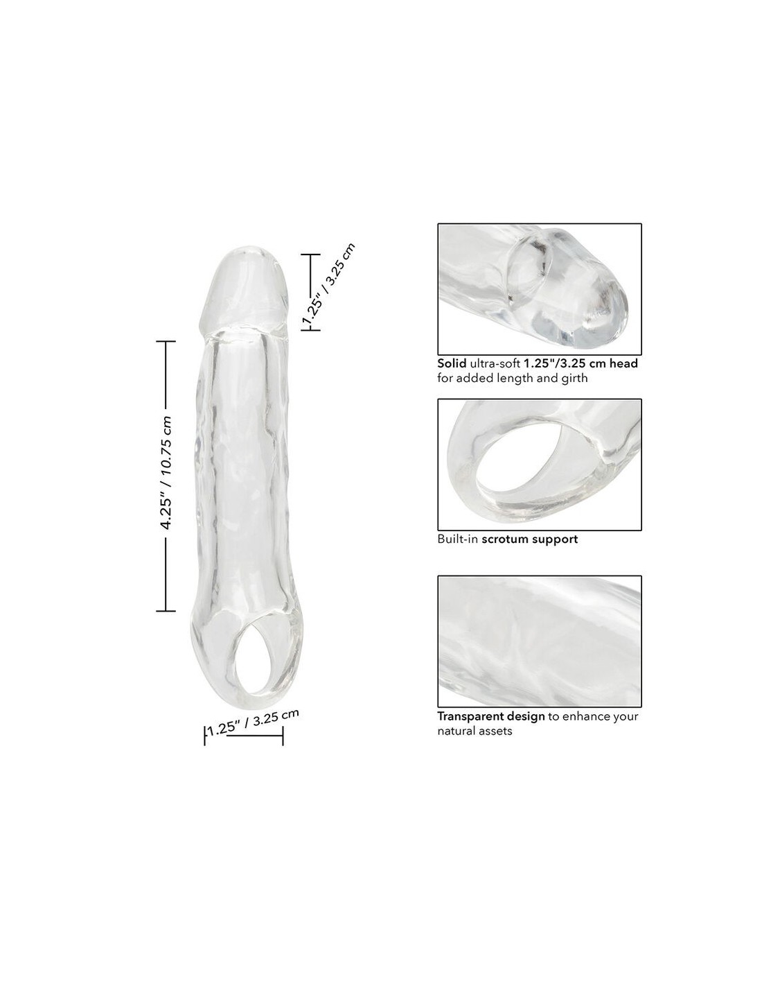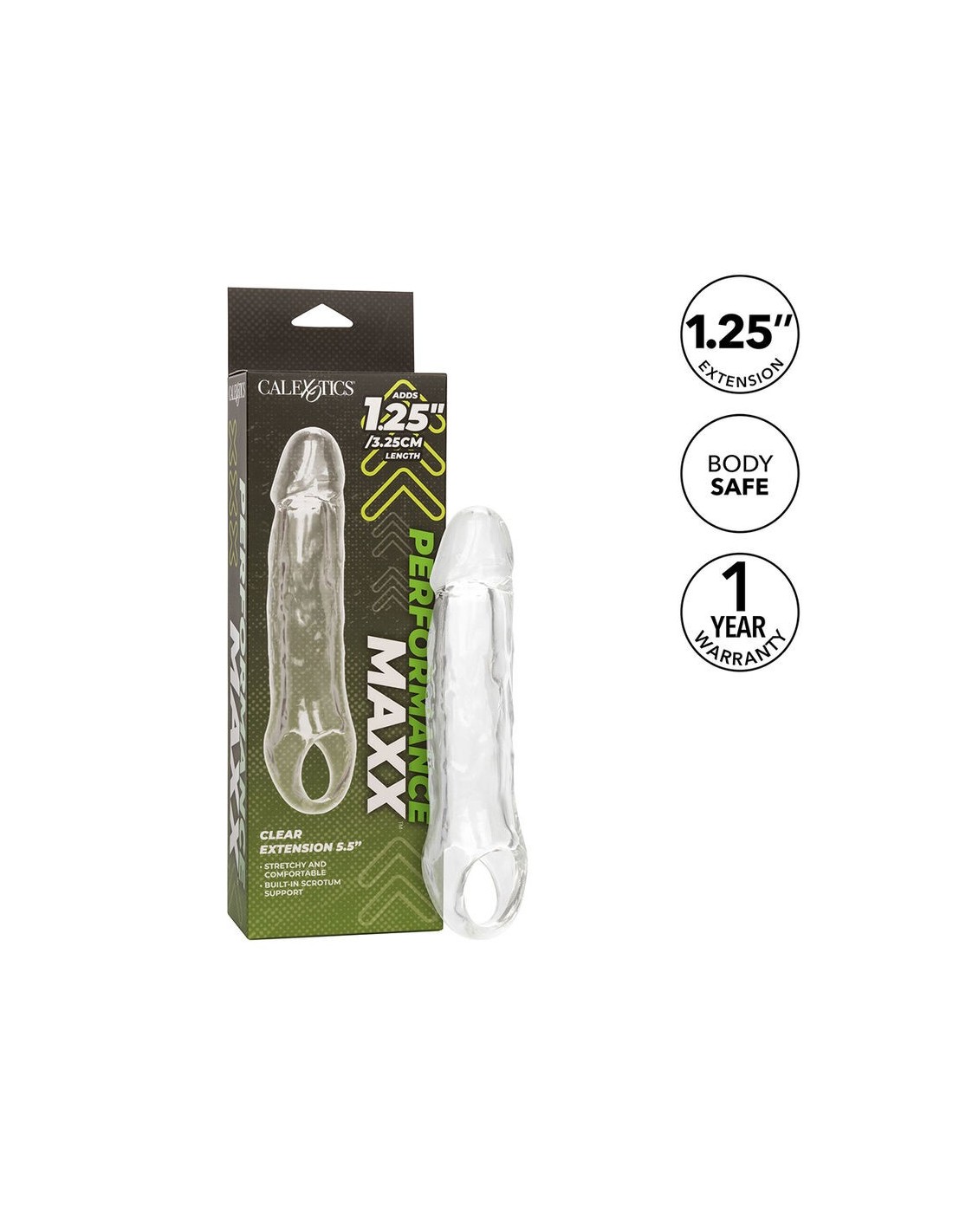 Scopri un piacere superiore con l'estensione trasparente Performance Maxx da 5,5". Questo accessorio ti permette di aumentare sia la lunghezza che lo spessore, donandoti maggiore sicurezza. La testa solida ultra morbida, di 1,25 pollici (3,25 cm), assicura una sensazione estremamente realistica, mentre il design trasparente mette in risalto i tuoi attributi naturali, stimolando anche visivamente. Il tubo cavo dal profilo realistico garantisce comfort, mentre la cinghia scrotale integrata assicura stabilità durante l'uso. Realizzata con materiali sicuri per il corpo, senza profumo e privi di ftalati, questa estensione ti offre tranquillità e sicurezza. Che tu voglia rendere più eccitanti i tuoi momenti intimi o esplorare nuove sensazioni, la Performance Maxx Clear Extension 5.5" porta il piacere a un livello superiore.