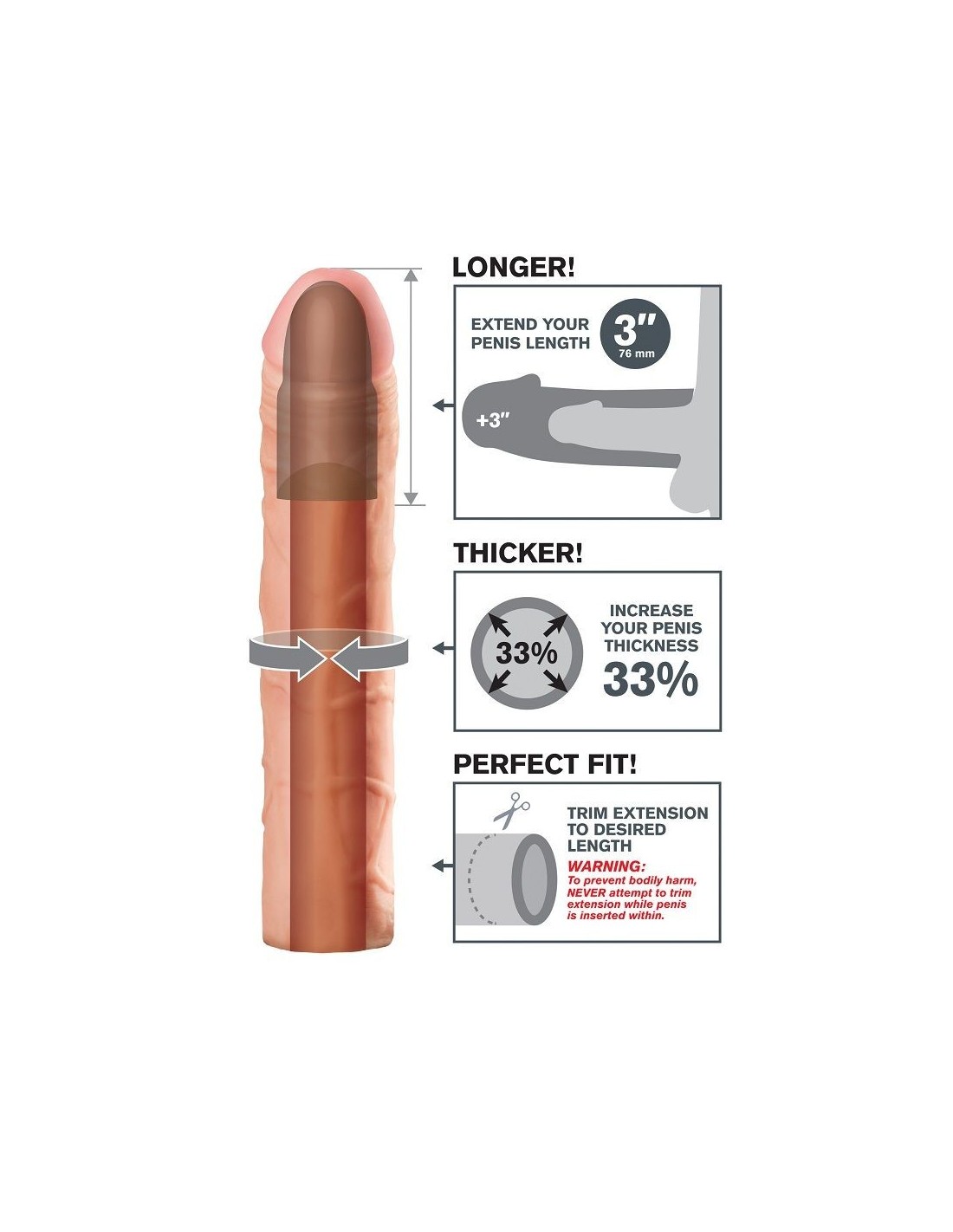 The Perfect 3" Extension è un'estensione personalizzabile che puoi facilmente adattare tagliandola alla base per una vestibilità perfetta. Realizzata in materiale super elastico, si adatta alla maggior parte delle misure e aderisce bene per aiutarti a durare più a lungo. Il tuo partner apprezzerà una penetrazione più profonda grazie ai 3" aggiuntivi sulla punta, mentre la struttura ultra realistica aumenta la circonferenza del 33% su tutta la lunghezza. Il morbido Fanta Flesh dona una sensazione naturale, come una seconda pelle, offrendoti la lunghezza, la circonferenza e la sicurezza necessarie per conquistare il tuo amante.