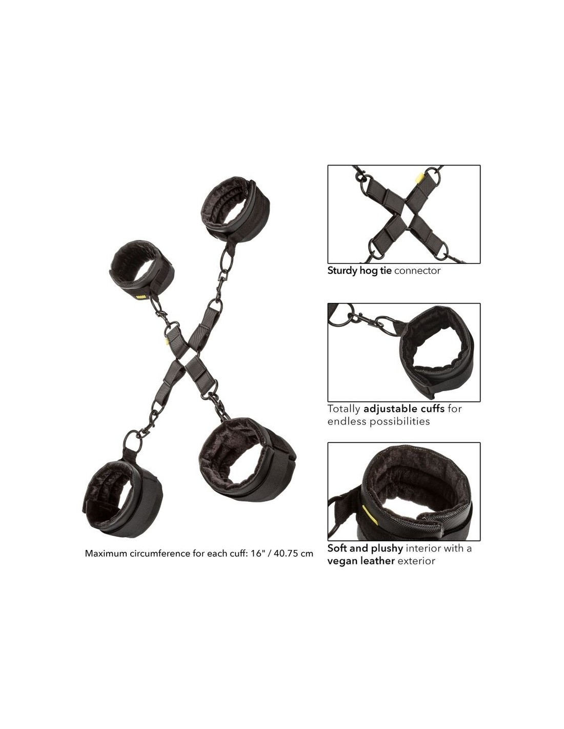 Imbriglia il tuo partner sottomesso legandogli mani e piedi dietro la schiena o davanti, sfruttando al massimo ogni posizione. Grazie ai 2 polsini regolabili per le caviglie e alle 2 manette per i polsi, anch’esse completamente regolabili, e alle chiusure a strappo in stile Velcro, questa legatura garantisce sicurezza e adattabilità. I fermagli universali e gli o-ring girevoli assicurano massima libertà di movimento e comfort, anche quando si è completamente immobilizzati.