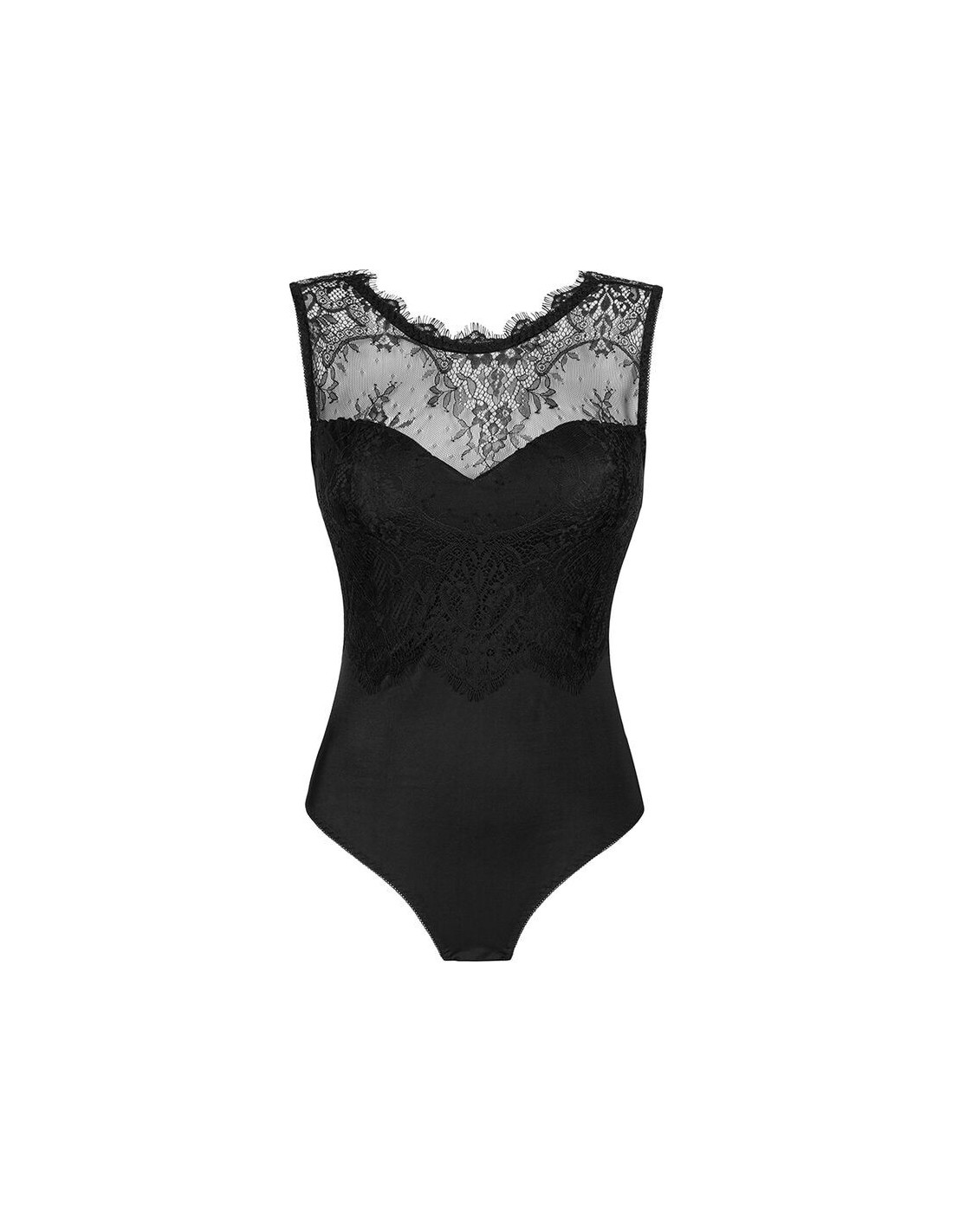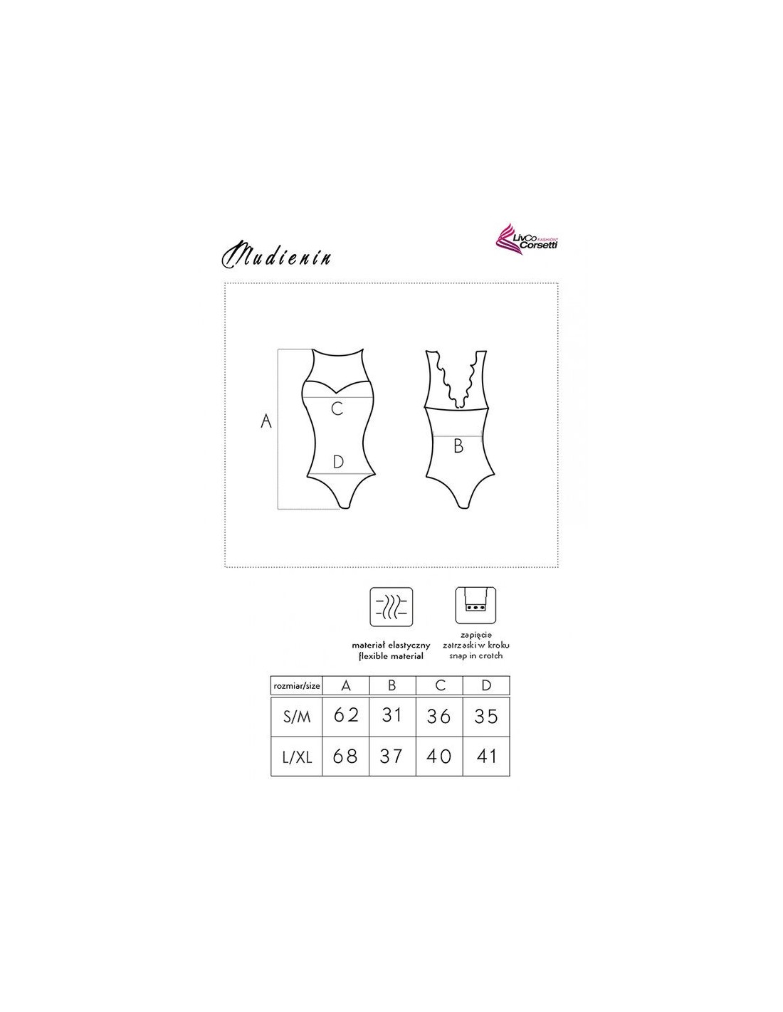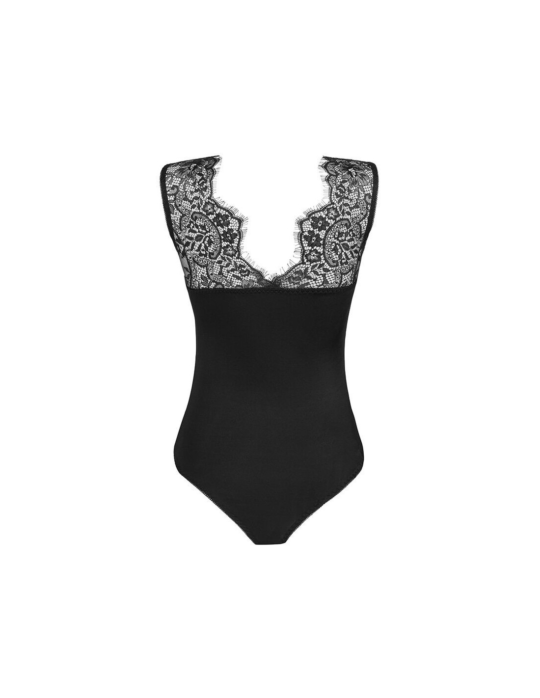 Il body Mudienin, nero e versatile, è perfetto non solo per la camera da letto, ma anche come elemento distintivo di un look quotidiano. Il design combina un pizzo raffinato e femminile con un tessuto liscio e leggermente lucido, creando un effetto elegante e sensuale. Il taglio classico presenta un ritaglio sul retro che lascia scoperti i glutei, mentre il busto è delicatamente coperto da un sottile pizzo. Anche la parte posteriore è impreziosita da dettagli in pizzo, che valorizzano scapole e braccia.