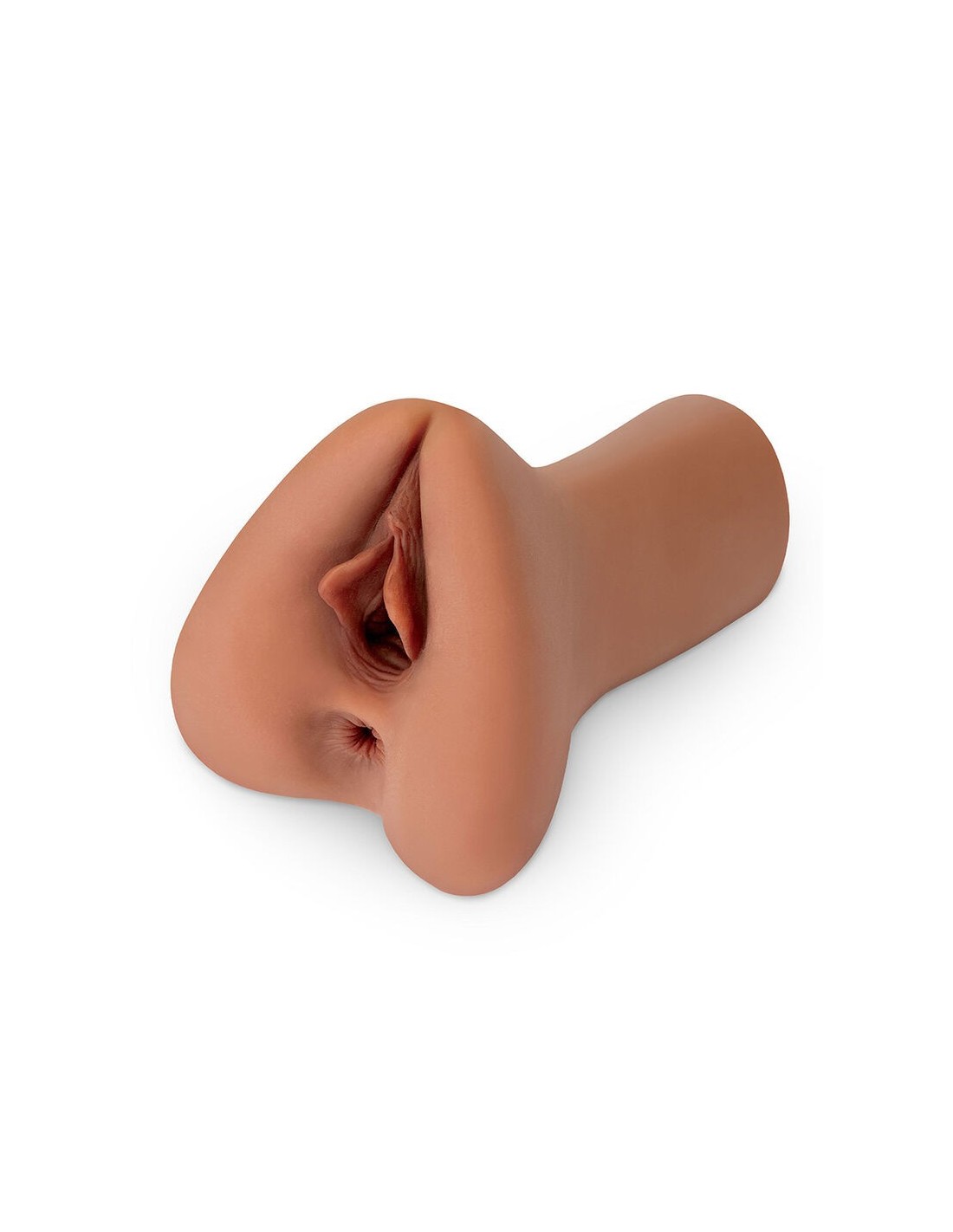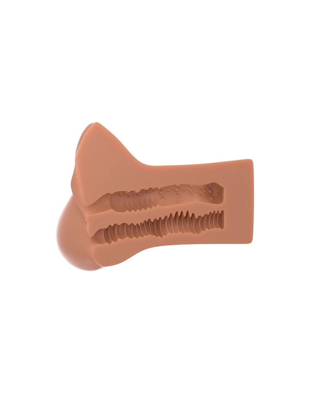 Questo stimolatore extra large si distingue per una pelle con una texture incredibilmente realistica e offre due diverse aperture per la penetrazione.