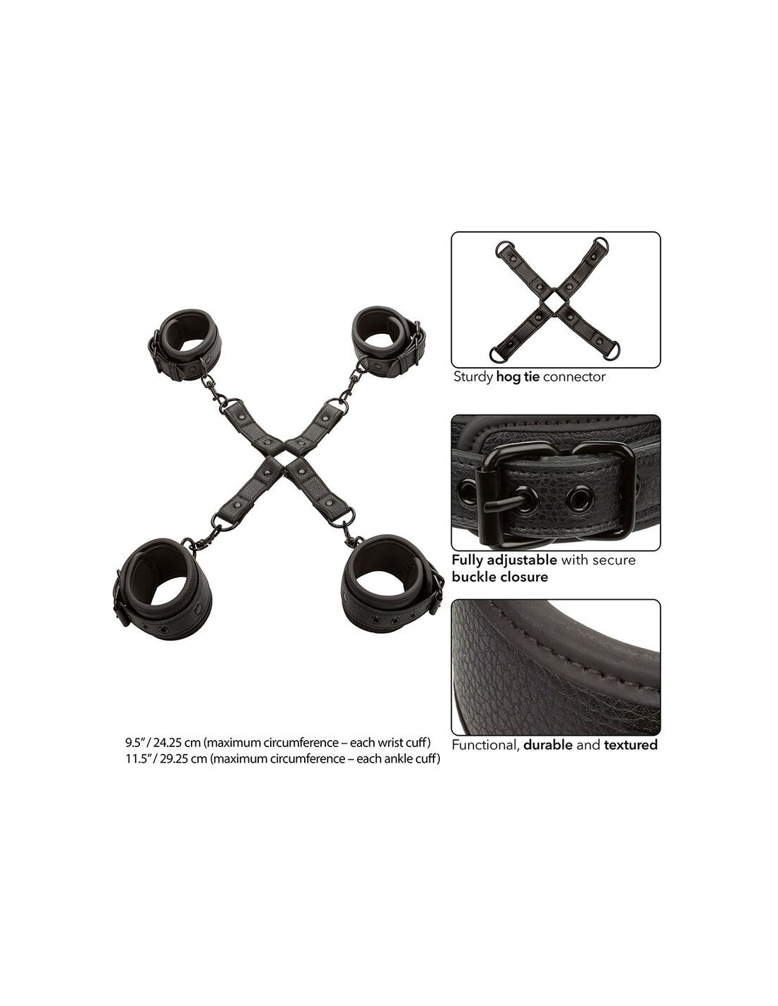 Al centro si trova il robusto connettore hog tie, che permette di sperimentare diverse posizioni e livelli di contenimento. Le chiusure universali e l’anello a D girevole aumentano la libertà di movimento. La doppia cucitura assicura una maggiore resistenza e durata nel tempo, mentre la finitura testurizzata offre un piacevole stimolo sensoriale. Versatile, può essere smontato per utilizzare i polsini singolarmente.