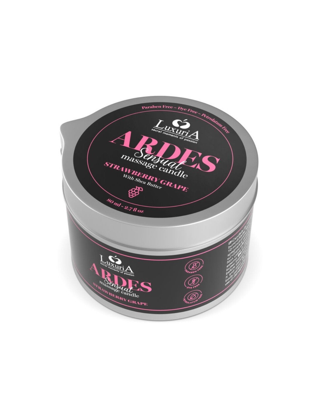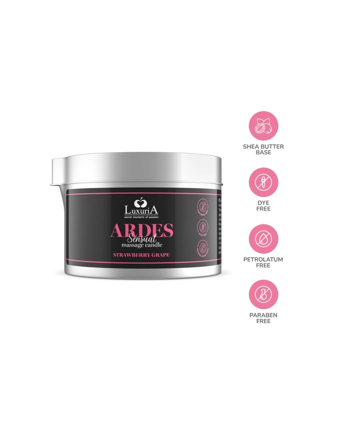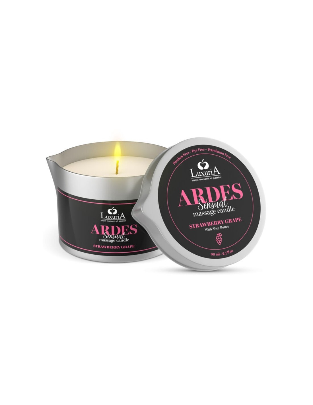 La candela da massaggio Luxuria Ardes Grape/Strawberry è un raffinato prodotto profumato, realizzato con burro di karité e arricchito da fragranze sensuali pensate per intensificare e stimolare i momenti di intimità. Le proprietà rassodanti ed emollienti del burro di karité donano sollievo e morbidezza alla pelle, mentre il suo aroma avvolgente ti accompagnerà in un’esperienza calda e passionale, capace di accendere ogni sensazione. Con Ardes, l’atmosfera si trasforma in un viaggio sensoriale di piacere ed erotismo.