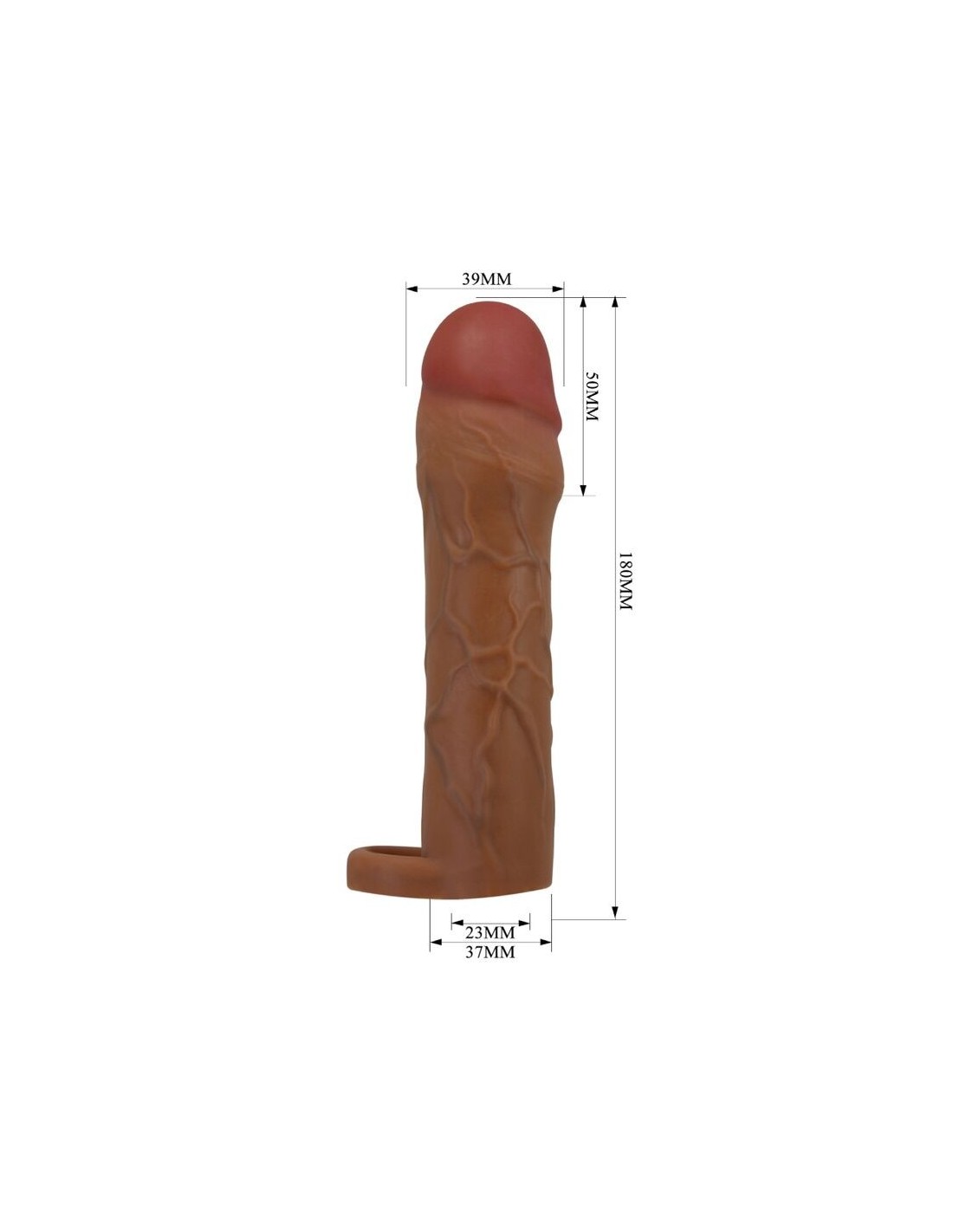 Potenzia le dimensioni del tuo pene con l'estensore Pleasure, realizzato in materiale ultra realistico per offrirti un piacere autentico. Questa guaina aggiunge 2 pollici di lunghezza e aumenta la circonferenza del 35%. La superficie esterna, caratterizzata da vene realistiche e una testa bulbosa, assicura sensazioni naturali e coinvolgenti per il tuo partner. All'interno, un canale liscio avvolge la tua erezione per un contatto e una stimolazione ottimale.