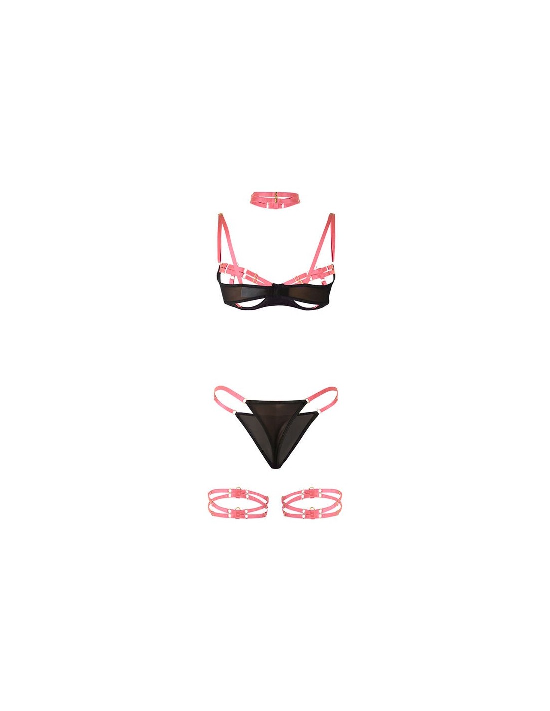 Realizzato con materiali di alta qualità (95% poliestere e 5% elastan/spandex), il set garantisce una texture soffice, un’ottima elasticità e una vestibilità che avvolge le curve in modo impeccabile. Il reggiseno, con spalline incrociate, valorizza il décolleté, mentre le trasparenze e le sfumature rosa a contrasto donano un’allure romantica e sofisticata.