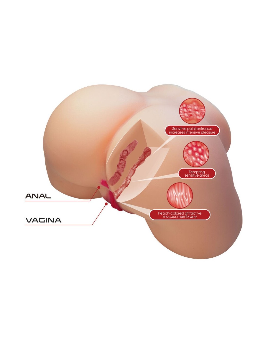 Questo masturbatore presenta due ingressi realistici: una vagina stretta e tortuosa, dotata di nervature interne che stimolano ogni movimento, e un ano stretto per chi cerca una sfida extra di pressione e realismo. Il suo tunnel interno è ricoperto da texture a spirale e noduli di piacere posizionati strategicamente per intensificare ogni penetrazione e portarti a orgasmi più profondi.