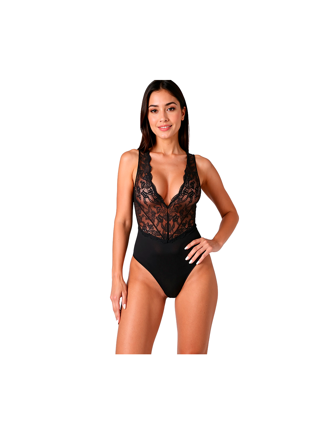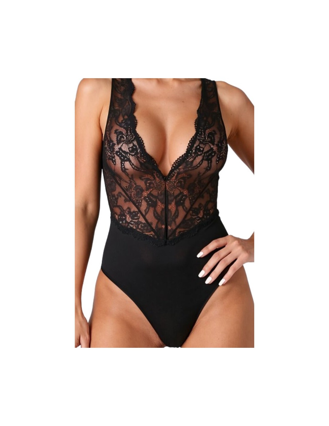 Il body EVALIE incarna l39essenza dell39eleganza e della sensualità femminile. Realizzato con una raffinata combinazione di delicato pizzo e tessuto morbido ed elasticizzato, rappresenta il perfetto equilibrio tra raffinatezza e minimalismo moderno. La profonda scollatura a V, impreziosita da un elaborato pizzo, esalta magnificamente il seno, donando leggerezza alla silhouette. I pannelli trasparenti sul davanti aggiungono un tocco audace, mentre la morbida sottoveste garantisce vestibilità e comfort impeccabili.