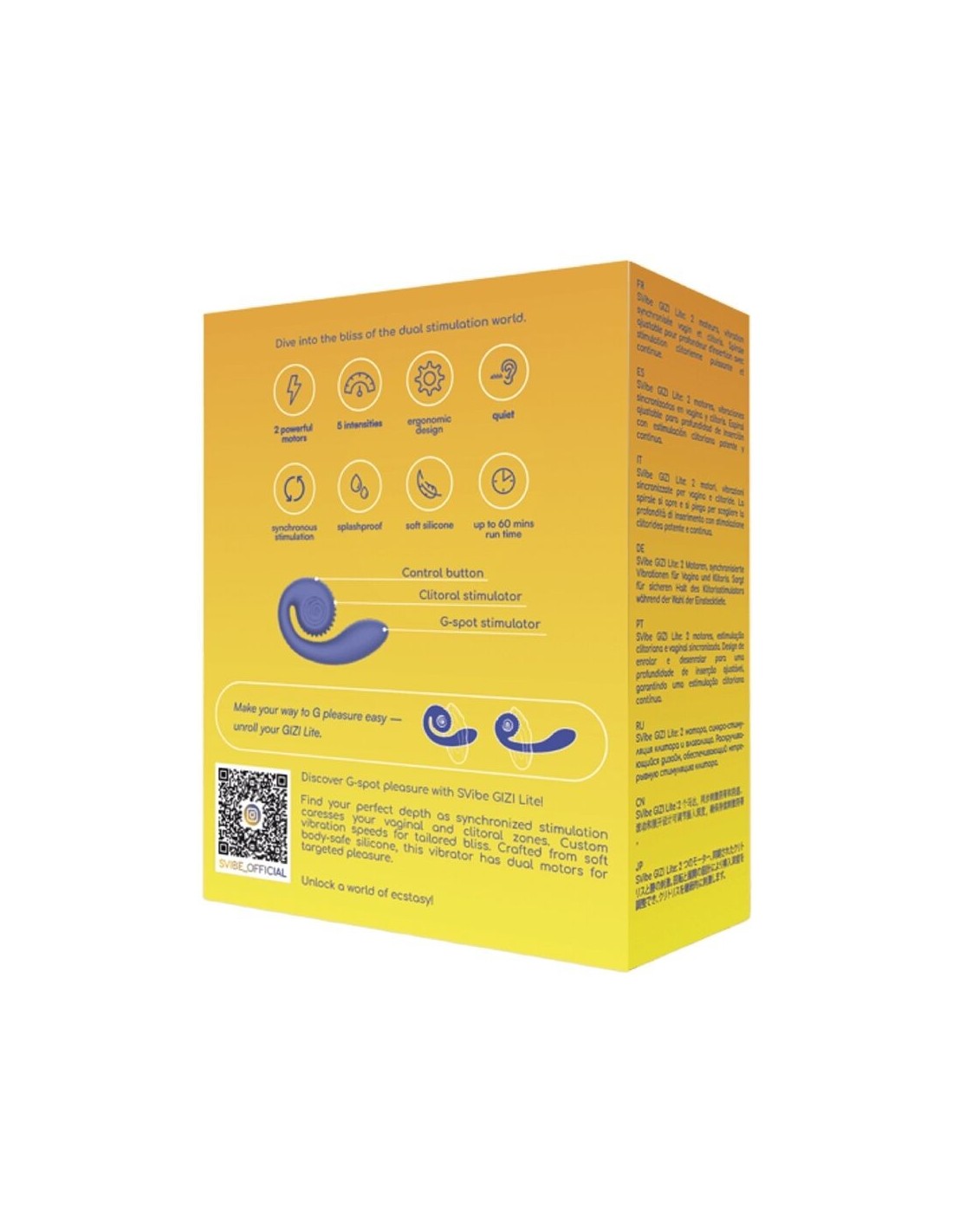 SVibe GIZI Lite è progettato per esplorare e potenziare il piacere del punto G attraverso una doppia stimolazione perfettamente sincronizzata. La sua forma permette di trovare la profondità ideale, mentre le vibrazioni accarezzano contemporaneamente sia la zona vaginale che quella clitoridea, creando un39esperienza equilibrata, immersiva e profondamente appagante.