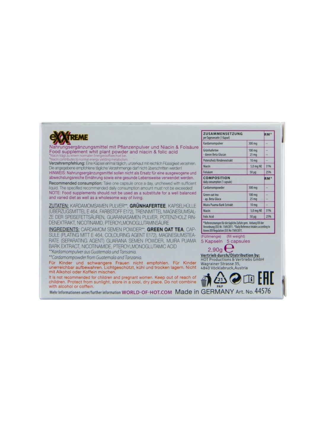 Polvere di sperma di cardamomo, tè verde all39avena, capsula (guanto di placcatura E 464, colorante E172), stearato di magnesio (agente separante), polvere di sperma di guaranà, estratto di corteccia di Muira Puama, nicotinamide, acido pteroilmonoglutammico.