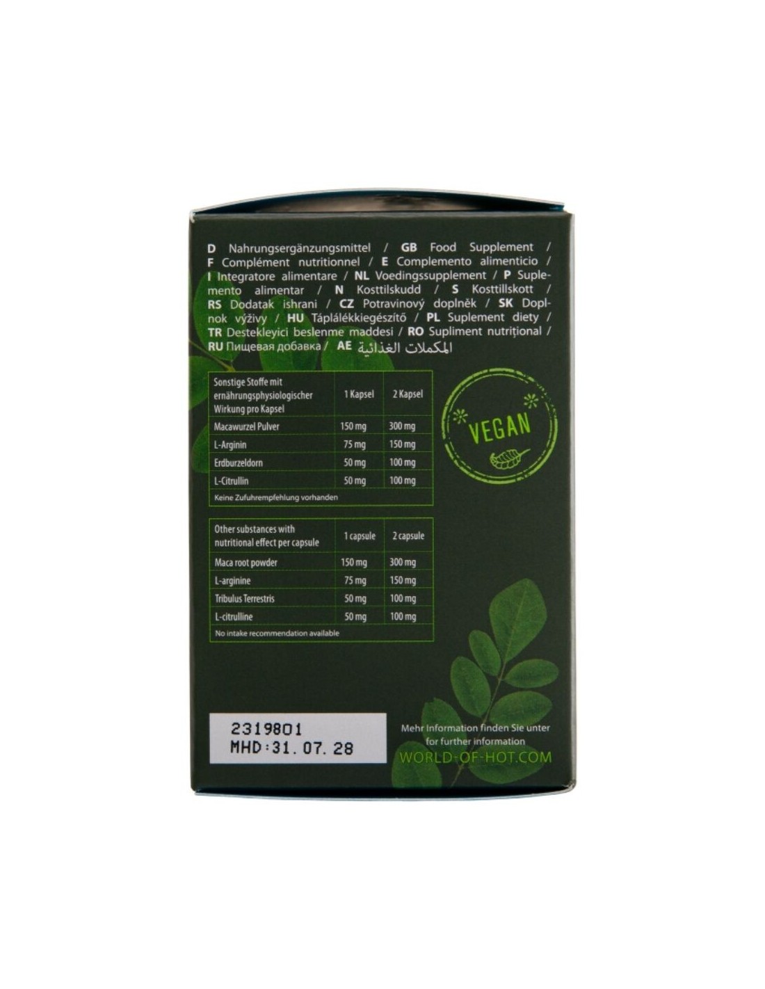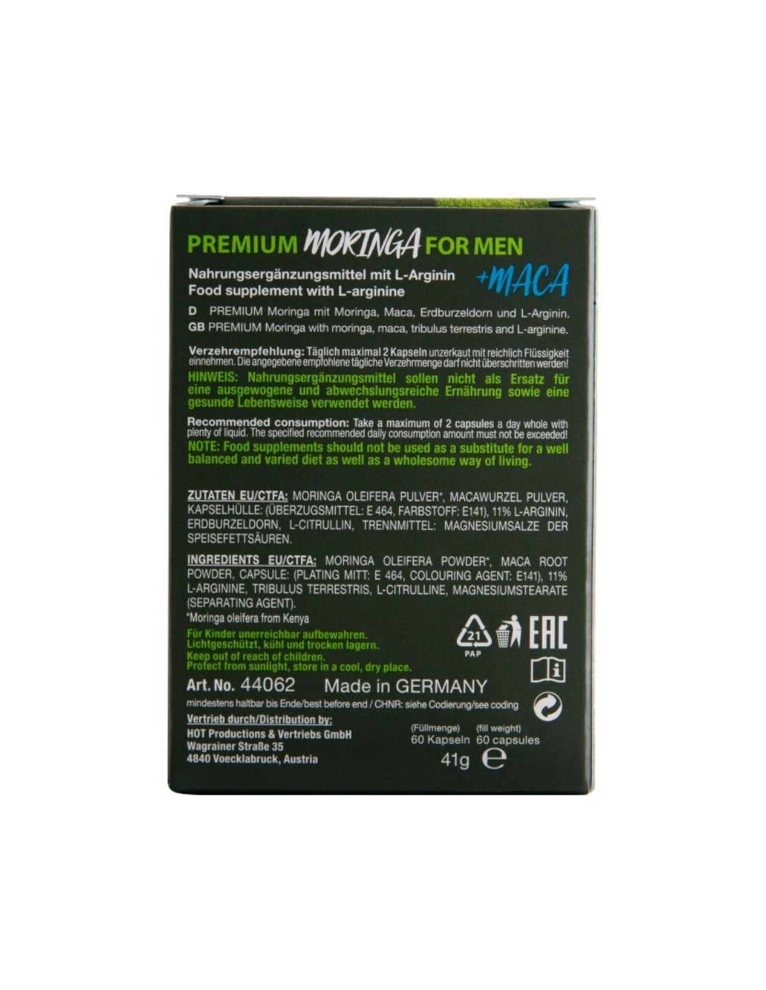 Polvere di Moringa Oleifera*, polvere di radice di Maca, capsula: (guanto di rivestimento: E 464, colorante: E141), 11% L-arginina, Tribulus Terrestris, L-citrullina, stearato di magnesio (agente separante).